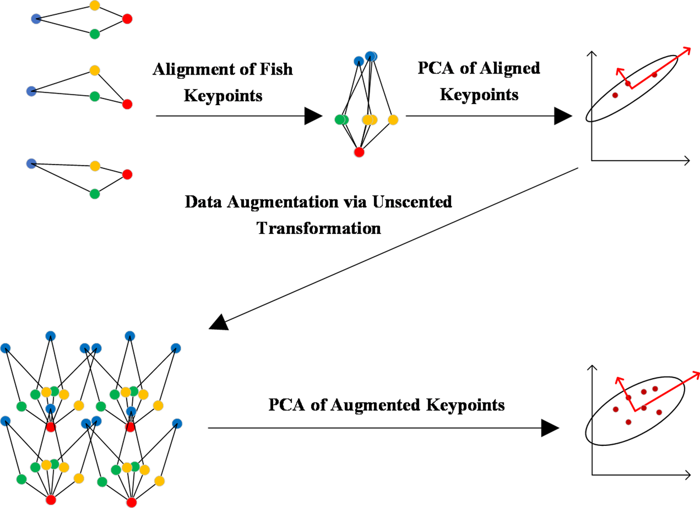 By performing alignment, the PDM model inherently disregards the translation and rotation of the shape. To address this limitation, we apply data augmentation to the aligned data. The construction of the PCA-based shape model of fish can be summarized in four key steps: (1) Alignment of Fish keypoints, (2) PCA of Aligned keypoints, (3) Data Augmentation via Unscented Transformation, and (4) PCA of Augmented keypoints. The complete workflow is shown in Figure 3 and the method’s detailed introduction is as follows.