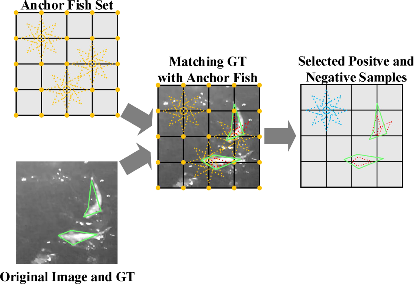Illustration of anchor fish and positive/negative sample selection process. The yellow dashed fish represents the anchor fish, the green solid fish represents the ground truth fish (GT), and the red dashed fish and blue dashed fish represent the positive and negative samples, respectively, selected from the anchor fish.
