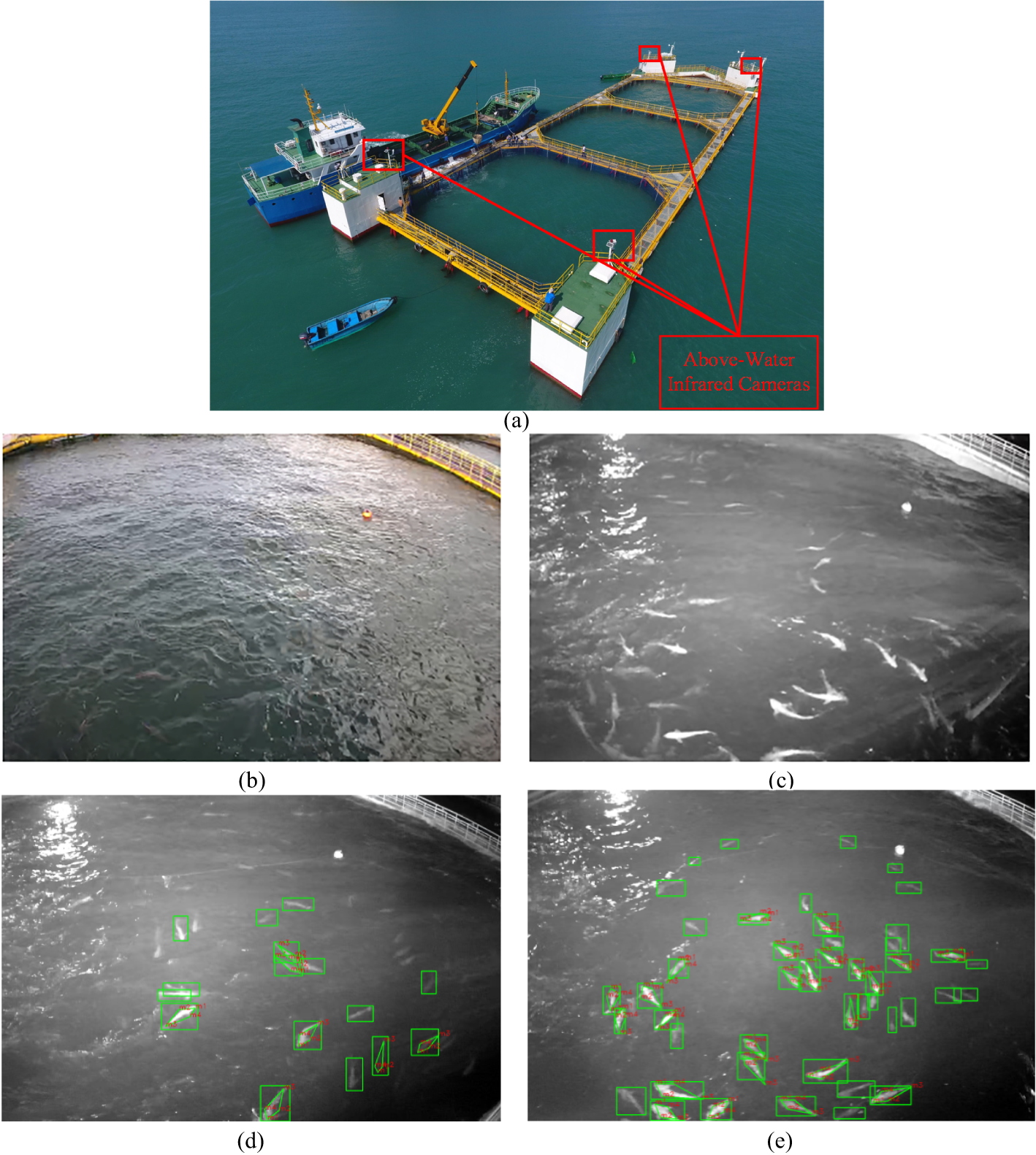 (a) Offshore truss-structure net cage with above-water infrared cameras for fish data collection; (b) Images collected during the day; (c) Images collected at night; (d, e) Labeled images.