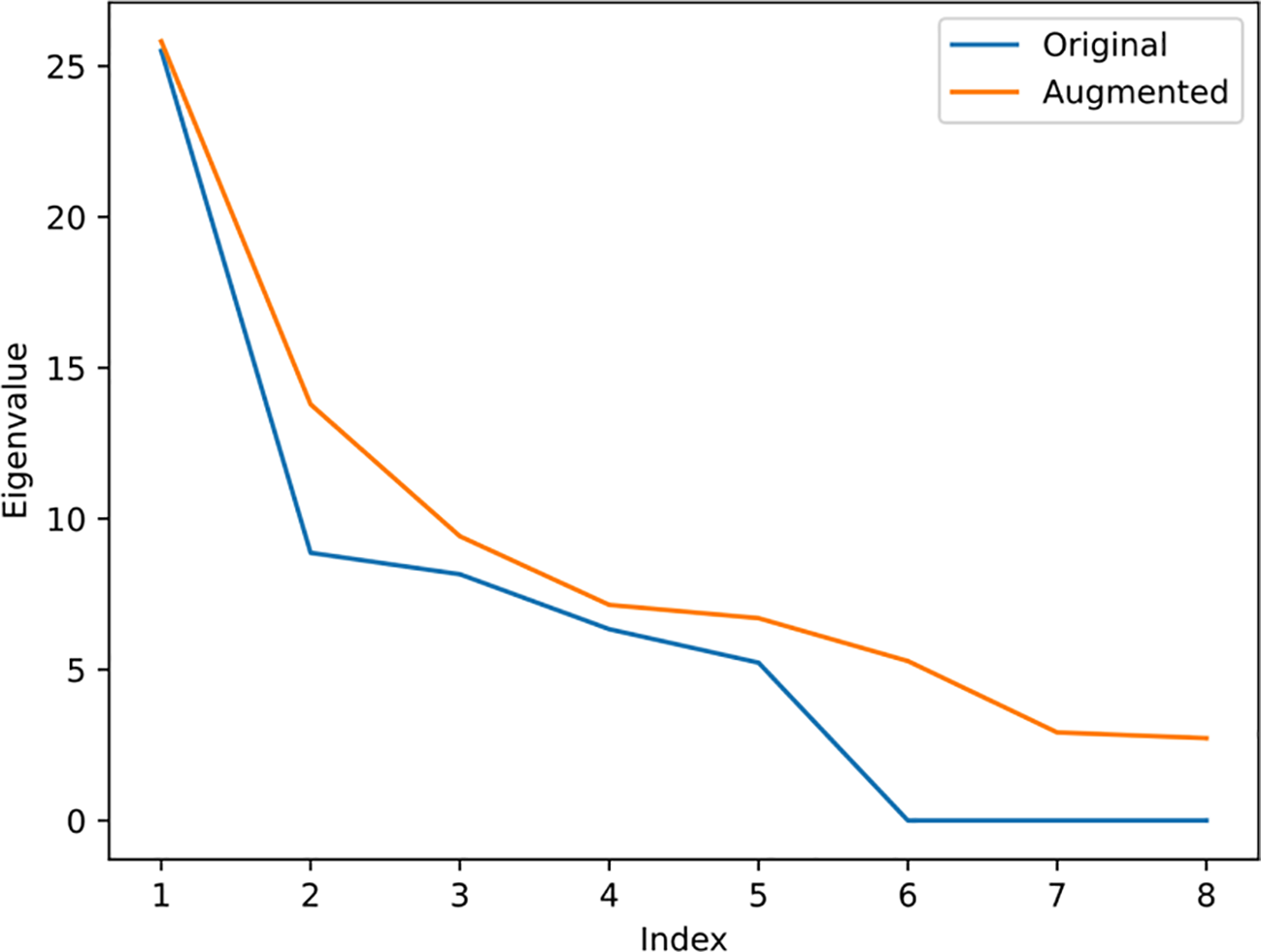 Original and augmented eigenvalues in descending order. The results show that after data augmentation, all eigenvalues have increased.