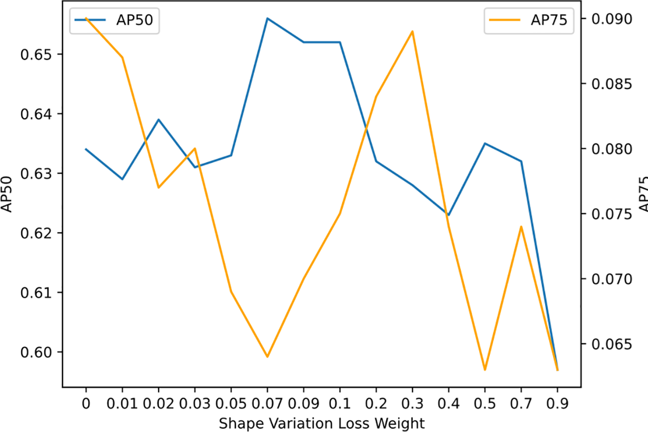 This experiment examines the effect of varying the number of the selected principal components used for encoding (which influences the size of the output encoded feature vector) and selecting different perturbation parameters for unscented transform on the AP metric. To isolate the impact of shape variation loss, the loss weights for all models are set to 2, 1, and 0. The “PCA_Original” represents a network without unscented transform-based data augmentation. In contrast, the “PCA_a_b_c” networks incorporate data augmentation with perturbation parameters a, b, and c, which correspond to orr pixels, ixe pixels, and nde°n respectively. The results in Table 2 reveal that accuracy increases with the number of the selected principal components. However, larger perturbations in data augmentation do not always yield better results. The optimal accuracy is achieved with the parameter setting of 1_1_2p5.