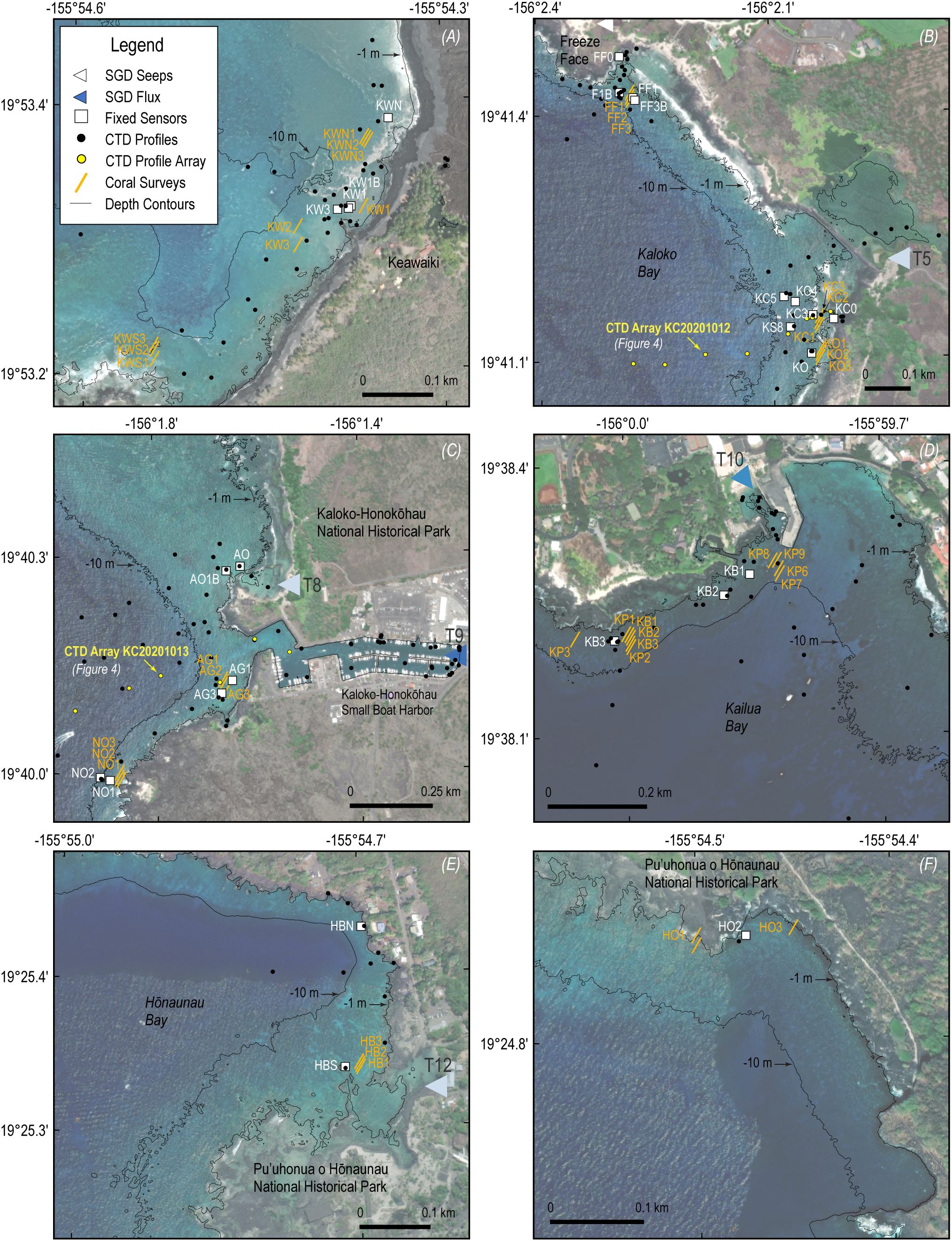 Figure 2. Maps of sampling locations including fixed sensors (white squares), CTD profiles (black circles), featured CTD profile arrays (yellow circles), and benthic surveys of coral cover and bleaching (gold lines) at Keawaiki (A), Kaloko Bay (B), Kaloko- Honokōhau Harbor entrance (C), Kailua Bay (D), Hōnaunau Bay (E), and outer Hōnaunau (F).