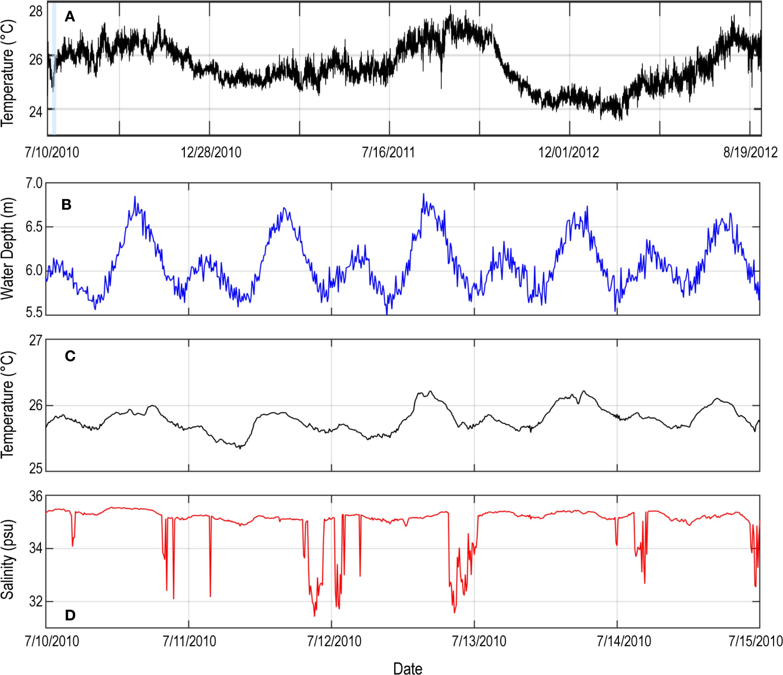 Figure 3. Time-series plots of nearshore water temperature for summers 2010, 2011, and 2012 (A) and corresponding water depth (B), temperature (C), and salinity (D) for the period 10 Jul 2010 through 15 Jul 2010 (blue bar in (A)) at site KO located at -4 m (MSL) in Porites lobata coral habitat, showing decreases in temperature reaching 0.75°C and salinity of ~4 PSU in response to daily ebb tides.