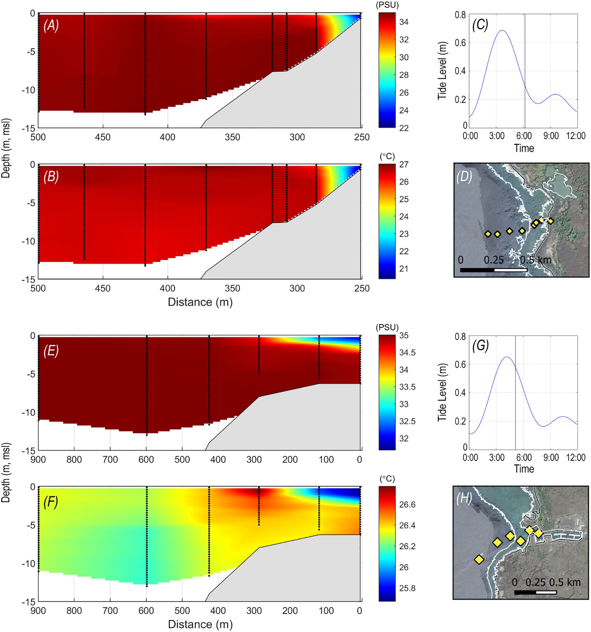 Figure 4. Plots of salinity (A) and temperature (B) depth profiles during ebb of 12 October 2010 (C) extending offshore of Kaloko Bay (D) and salinity (E) and temperature (F) depth profiles during early ebb on 13 October 2010 (G) offshore of Kaloko-Honokōhau Harbor (H) showing water that bathes extensive areas of coral reef in 3–5-m depth with lower salinity and 5°C–6°C lower temperatures than offshore marine water. Note varying color bar scale in (A, B) and (E, F).