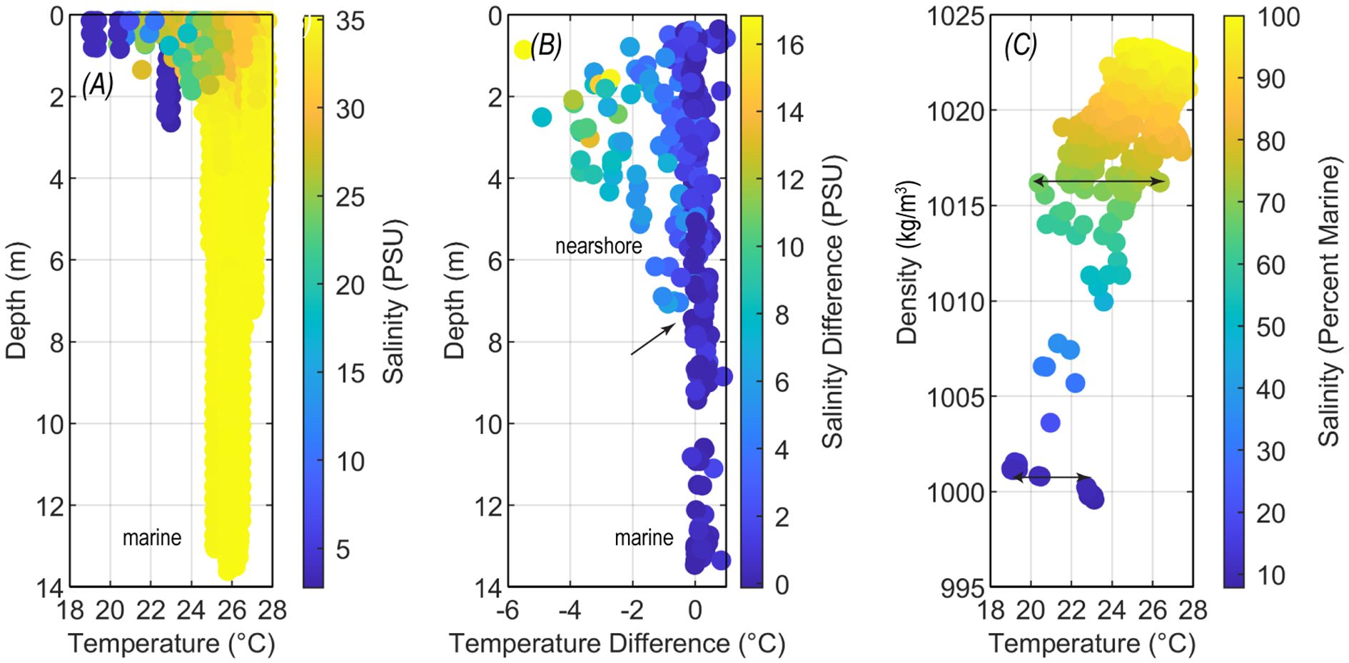 Figure 5. Plots of CTD profiles across the western coast of the Island of Hawai’i between 2010 and 2013 showing lower water temperatures near the surface and with lower salinity (A), the difference between top and bottom water reflecting stratified low temperature and salinity to ~7-m depth [arrow in (B)], and variability in temperature for discrete density and salinity that ranges 4°C–6°C [arrows in (C)].