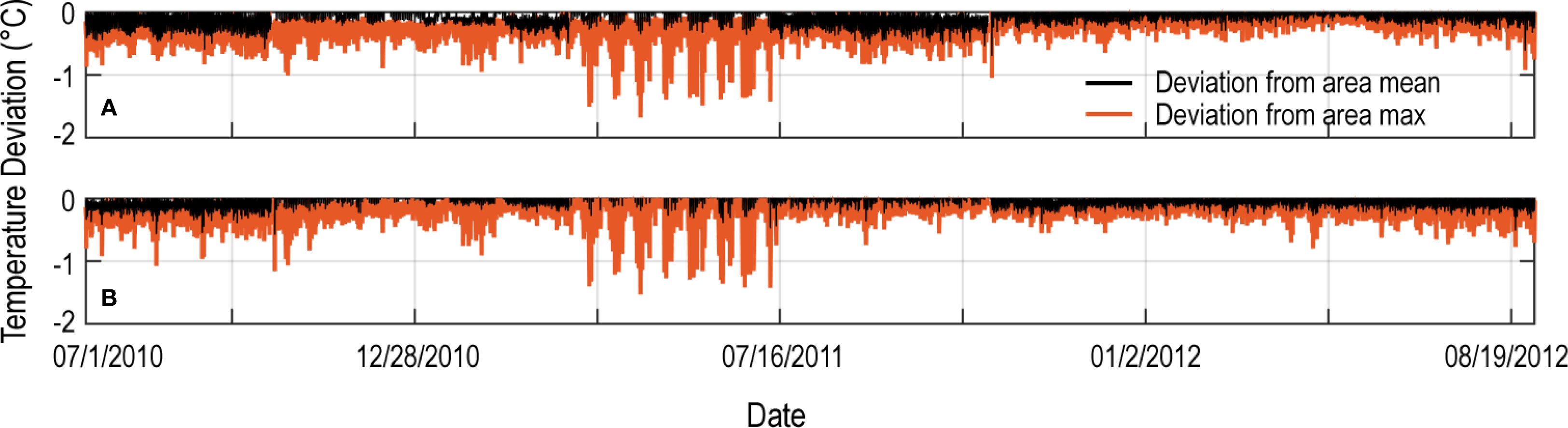 Figure 6. Time-series plot showing the extent that water temperatures at site KC3 [(A) water depth 4 m, 100 m from groundwater seep] and KO [(B) water depth 4 m, 250 m from groundwater seep] were depressed below the mean (black) and maximum (orange) marine water temperatures between 1 July 2010 and 1 September 2012 observed in Kaloko Bay (locations shown in Figure 2B).