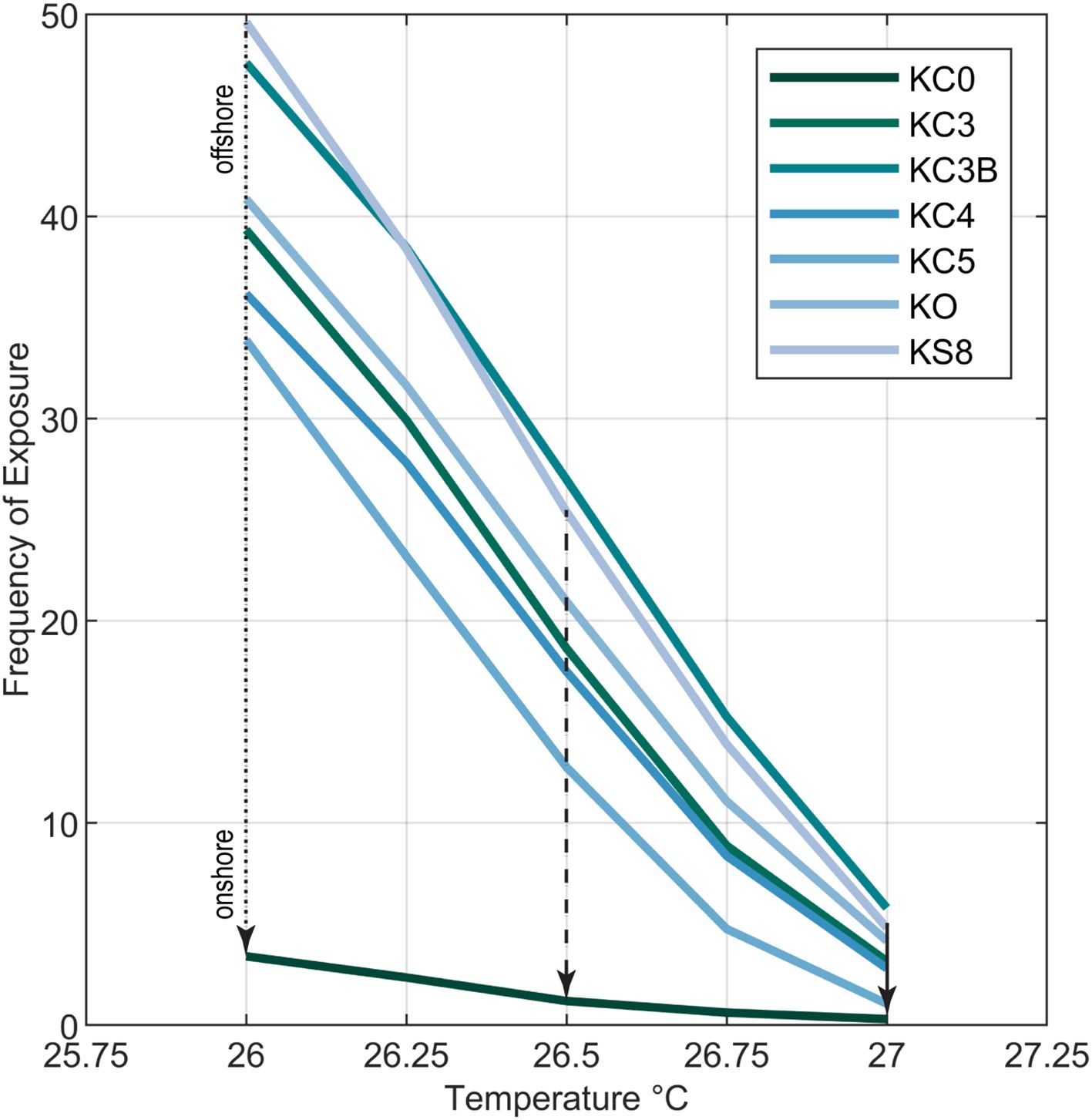 Figure 7. Plot of the frequency that water temperatures at sites in Kaloko Bay exceeded thresholds that induce thermal stress (dotted, dashed, and solid arrows for 26.0°C, 26.5°C, and 27.0°C, respectively) showing that exposure is steadily reduced by SGD closer to shore (between sites) and up to 47% of the time relative to offshore (dotted arrow).