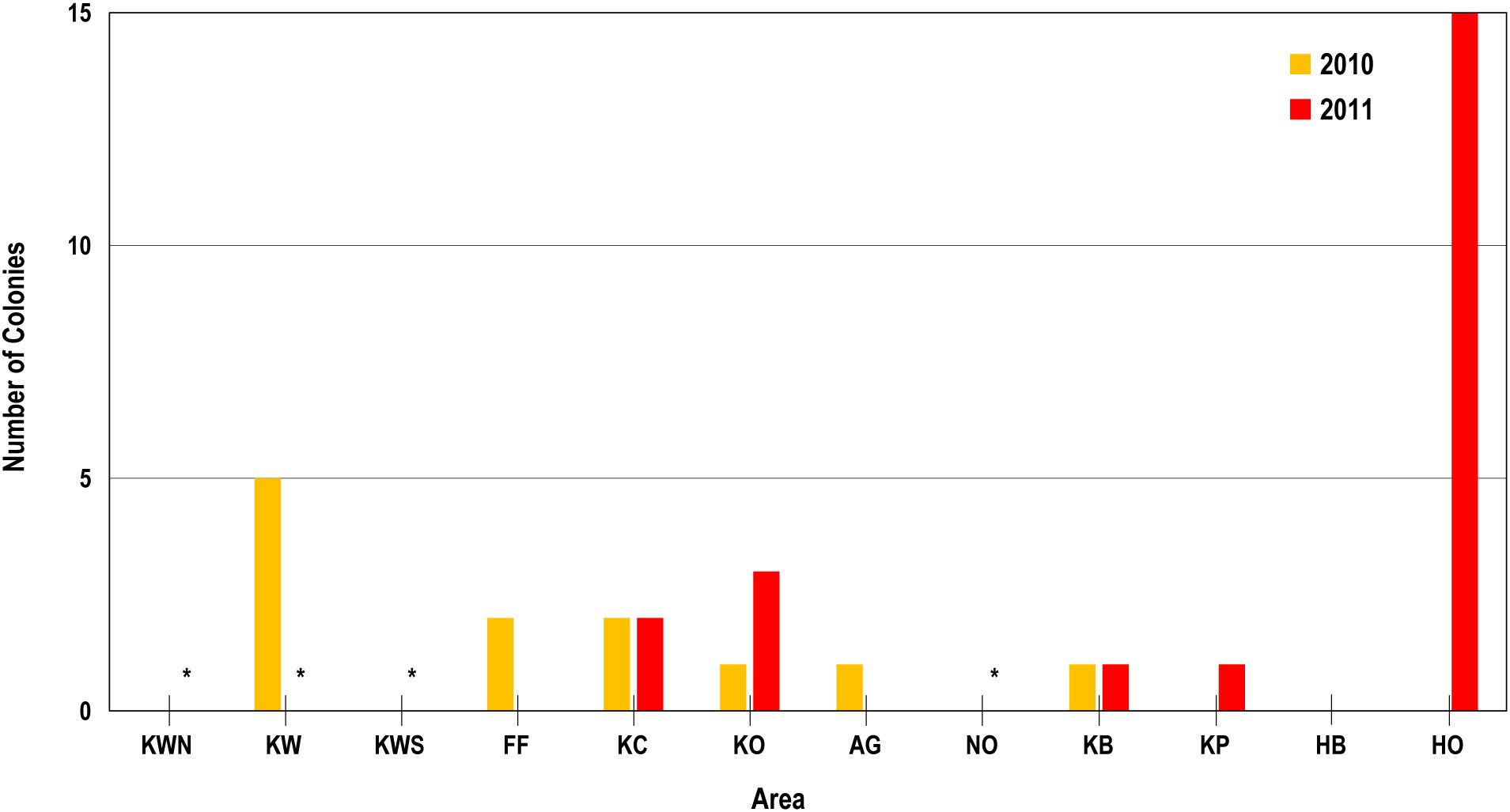 Figure 8. Bar plot of number of bleached coral colonies in each area in October 2010 (orange) and November 2011 (red) showing generally less bleaching at sites KC, KP, and HB that were closer to cold SGD seeps relative to site offshore KO, KB, and HB, respectively. Asterisks indicate site not surveyed in 2011.
