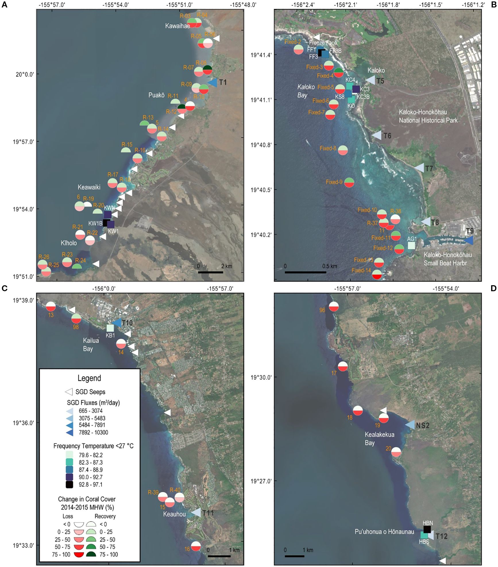 Figure 9. Maps showing generally lower coral bleaching and loss (red semi-circles) and higher recovery (green semi-circles) following the 2014–2015 marine heat wave (after Gove et al., 2023) close to SGD seeps, especially seeps with higher flux (darker blue triangles), and more frequent temperatures below 27 °C driven by SGD (darker blue squares) including R-06 (Kawaihae), R-11 and R-12 (Puakō), R-20, 6, R-22 (Keawaiki), and R-23 and R-24 (Kīholo) (A), Fixed-3 (Freeze Face), Fixed-4 and Fixed-5 (Kaloko), and R-38, Fixed-11, Fixed-12 (Kaloko-Honokōhau Harbor entrance) (B), 98 and 14 (Kailua) and R-40 (Keauhou) (C), and 20 (Kealakekua Bay) (D).