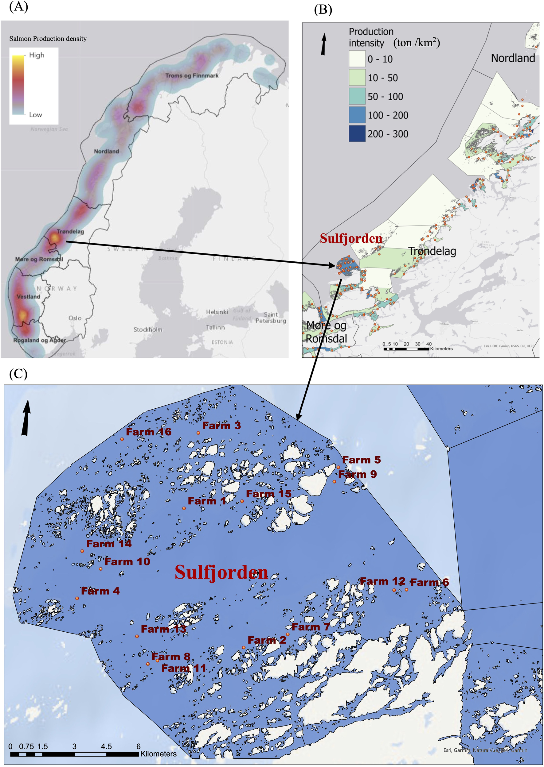 Study area in Norway with surveys from 2016 to 2022. (A) Heatmap of salmon production density (ton/km2). (B) Location of salmon farms and production density of Trøndelag county, central Norway. Orange dot: locations of salmon farms; (C) Location of salmon farms in Sulfjorden in Frøya region. Number: the identification of individual farms.