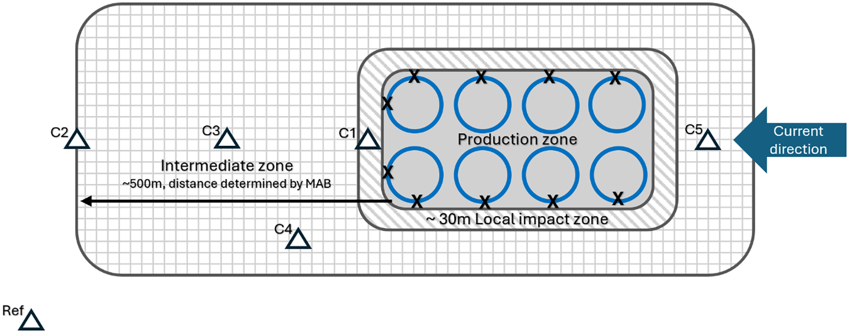 Schematic illustration of sampling locations (triangles) for C-assessment, adapted and revised from after NS 9410 (Standard Norge, 2016). The radius distance of the intermediate zone is determined by the MAB (Maximum allowable biomass). If the MAB is less than 2000 tons, the radius is 300 meters. For MAB values between 2000 and 3600 tons, the radius is 400 meters. If the MAB exceeds 3600 tons, the radius is 500 meters. The sampling stations should be placed based on information on currents and topography, preferably in the primary direction of the dispersion flow. If there are limited deep areas nearby, samples should be taken there (C4) and also consider samples in the return flow direction (C5). For illustrative purposes, crosses have been inserted to show the sampling area in a B survey, at the edge of each cage.