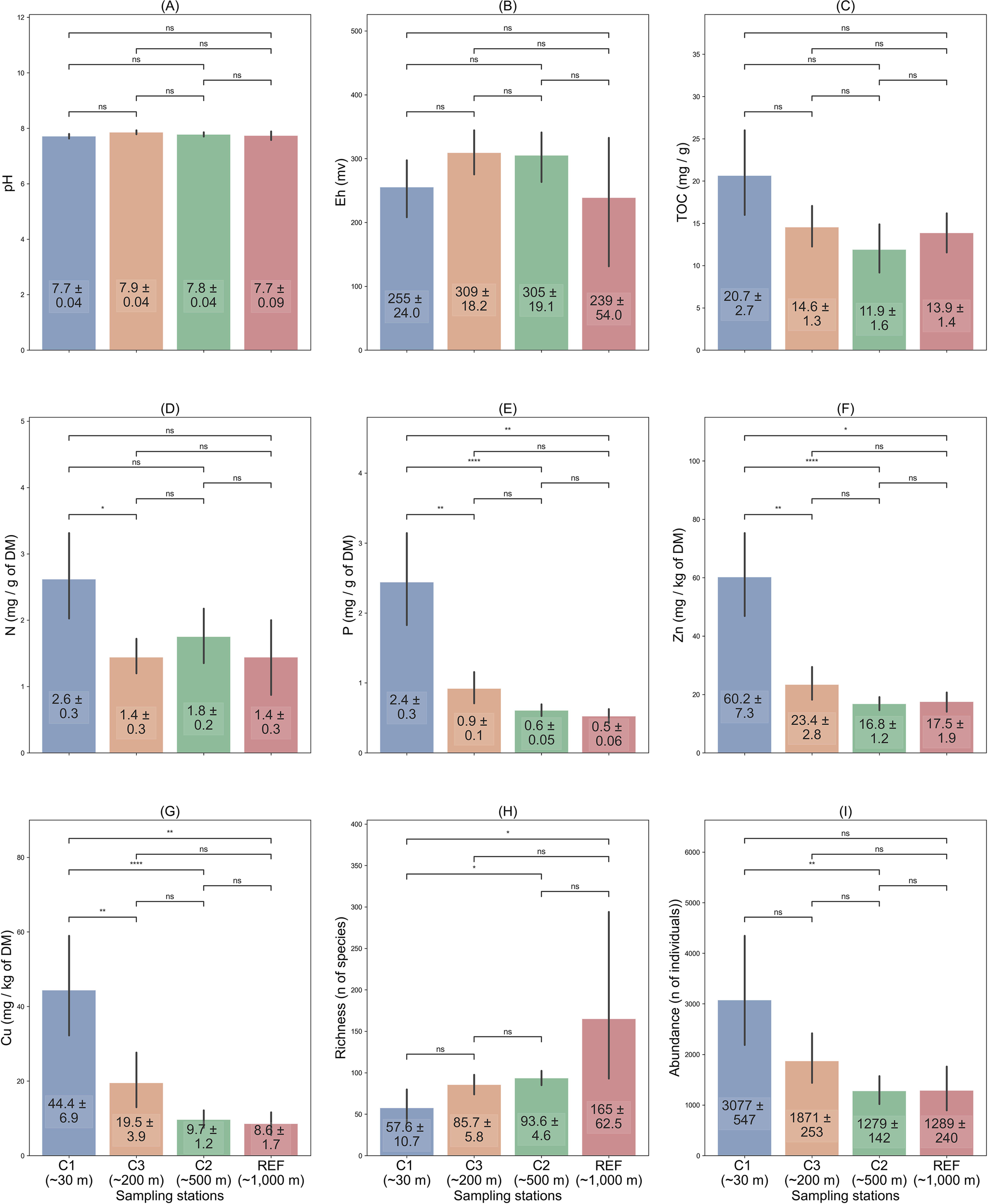 Mean values ( ± SE) for chemical and biological variables from various sampling locations from sea cage from salmon cage farms in Sulfjorden from 2016 to 2022. (A) pH, (B) Eh (oxidation-reduction potential), (C) Particulate Organic Carbon (C mg/g of DM), (D) Particulate Organic Nitrogen (N mg/g of DM), (E) Particulate Organic Phosphorus (P mg/g of DM), (F) Zinc (Zn mg/kg of DM), (G) Copper (Cu, mg/kg of DM), (H) Richness of benthic macrofauna (number of total species), and (I) Abundance of benthic macrofauna (number of total individuals). *Significant at p< 0.05, **Significant at p< 0.01, ***Significant at p< 1 × 10-3, ****Significant at p< 1 × 10-4, ns: not significant.