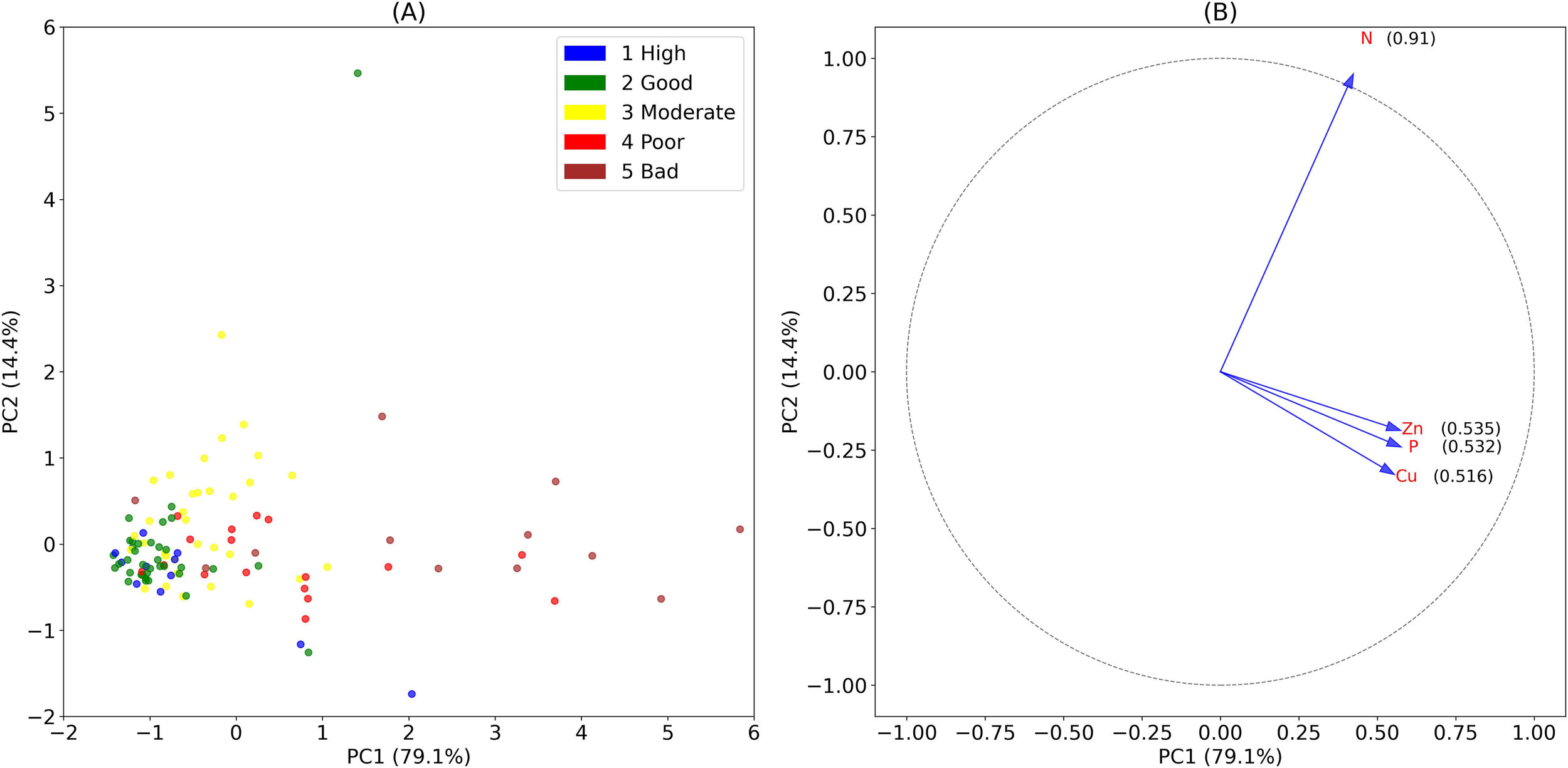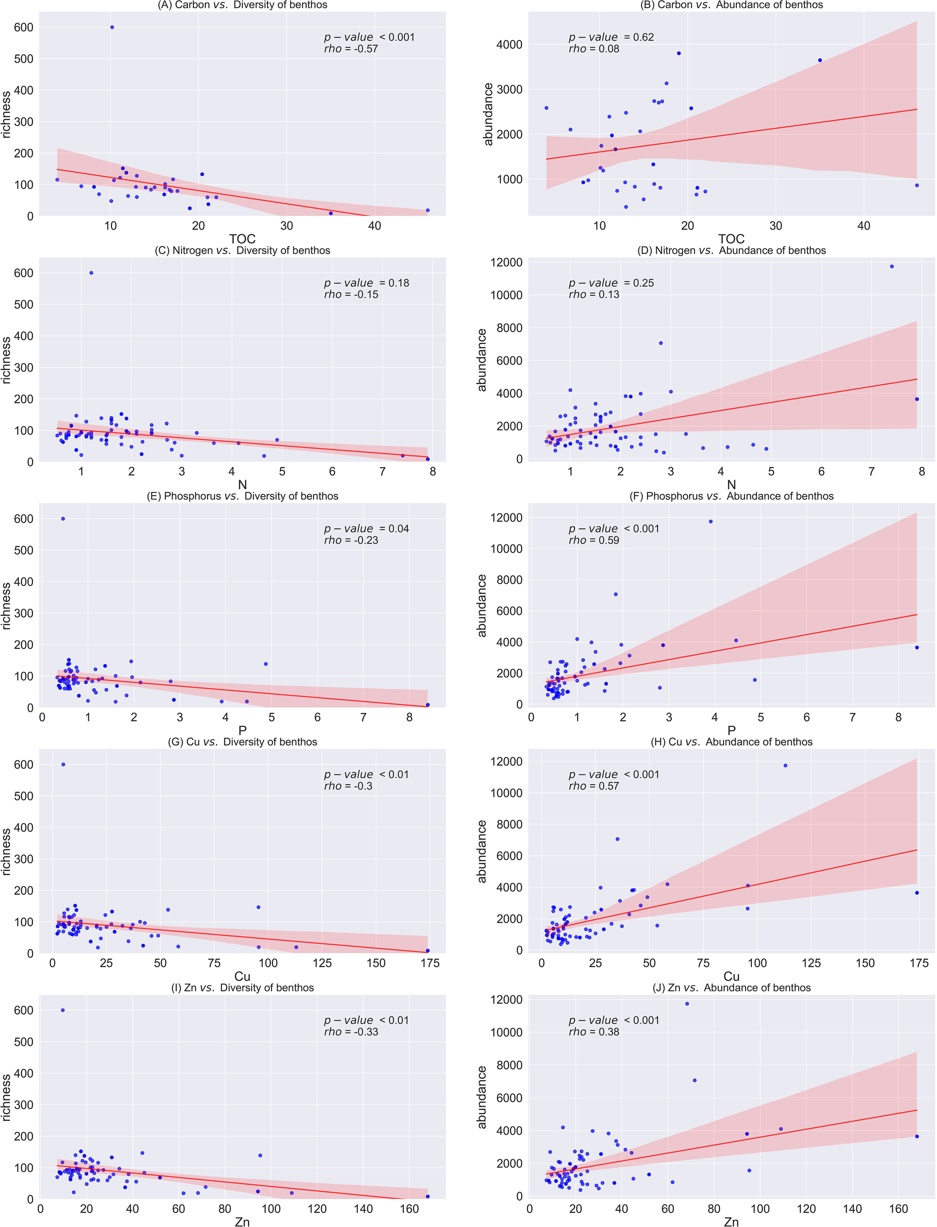 We used Principal Component Analysis (PCA) to investigate the relationship between chemical variables and benthic macrofaunal communities across different EQS. Regression analysis was then applied to assess correlations between the variables, while correlation strength and significance were assessed using Spearman’s nonparametric correlation coefficient (rho) and its corresponding p-value. The significance limits were set at 0.05. Regression curves were fitted using linear regression, with the model determined based on the best R2 value.