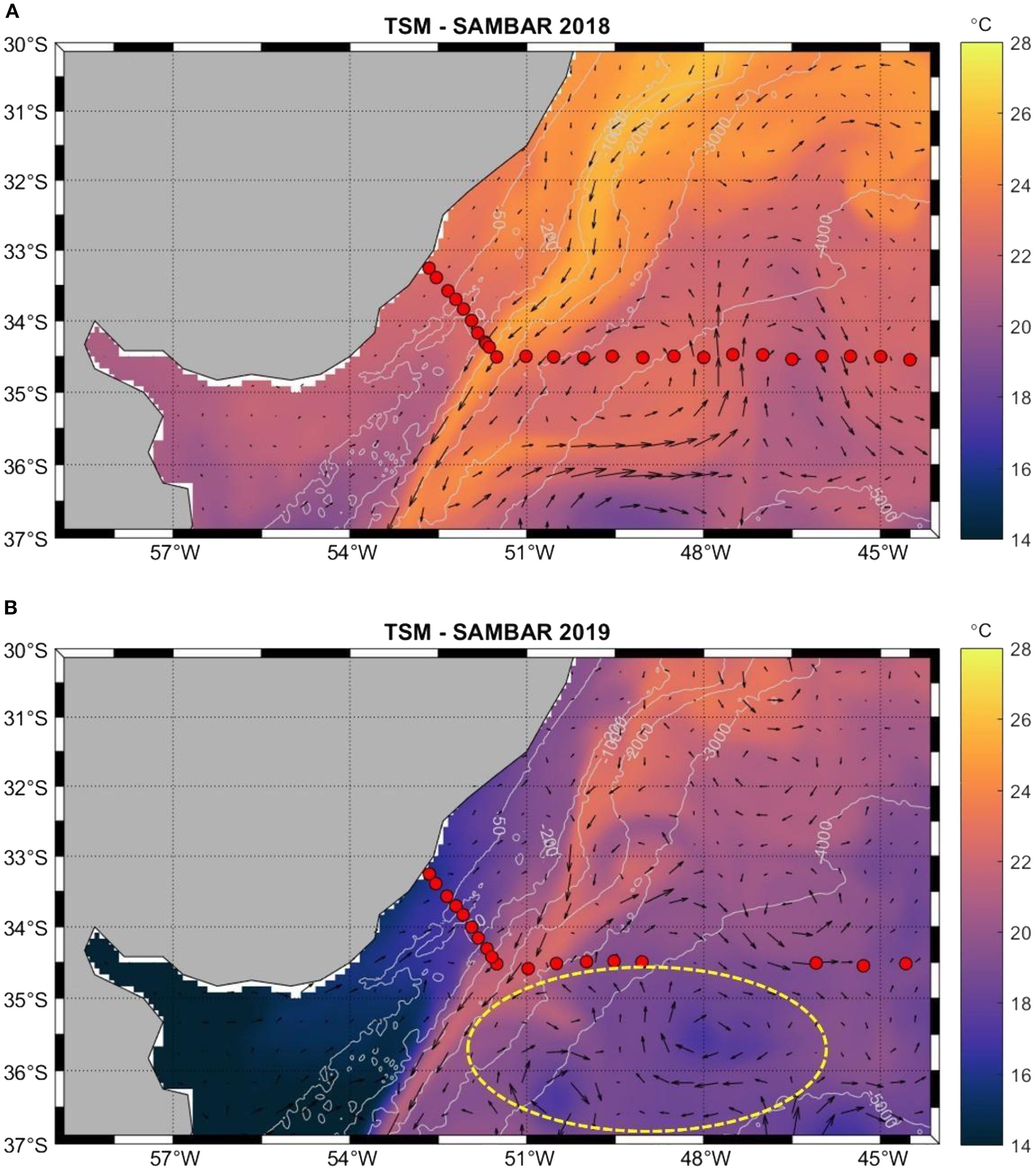 Figure 2. Sea surface temperature (SST; °C) in the southwestern Atlantic Ocean during the (A) 2018 and (B) 2019 campaigns, derived from the CMEMS reanalysis. The SST data have a 9 km resolution and represent an 8-day average (April 23–May 1, 2018, and June 18–26, 2019). The grey contours indicate isobaths, whereas the red dots represent sampling stations from both campaigns over the continental shelf and open ocean. The arrows indicate the currents. The yellow circle indicates the presence of eddies.