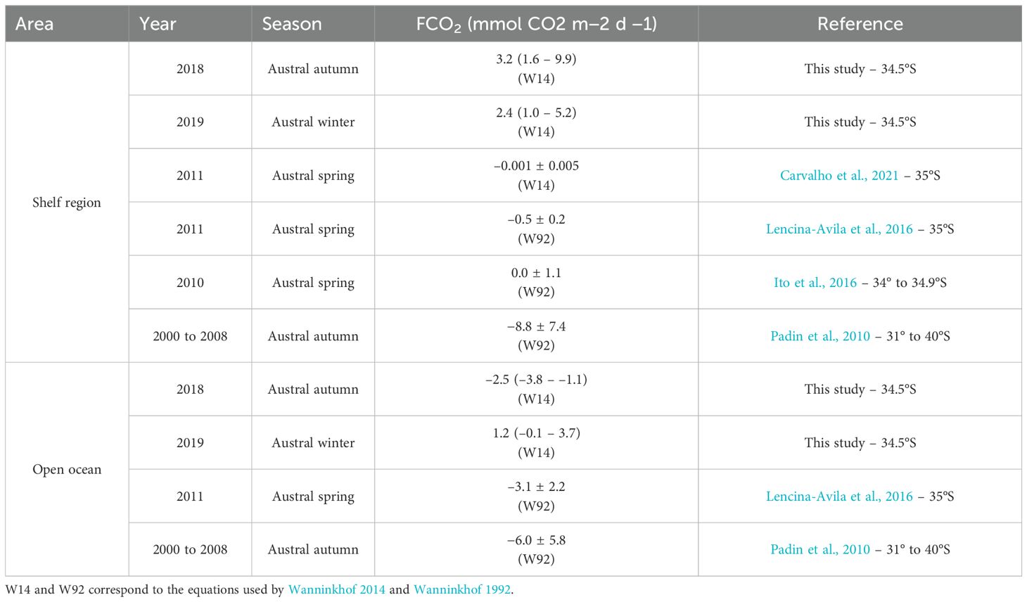The difference in pCO2 (ΔpCO2) between the two compartments determines the direction of net transfer between the ocean and the atmosphere. The ratio between the viscosity and molecular diffusion rate is represented by k (Weiss, 1974). In this study, the calculated coefficients of k were compared between 3 works: Wanninkhof (1992); Nightingale et al. (2000); Wanninkhof (2014), which are represented as W92, N00 and W14, respectively. The equations used for k calculations are summarized in Supplementary Table S1. Although W14 is a central choice, we also include other parameterizations (such as N00 and W92) (Supplementary Tables S2, S3) to provide different perspectives/scenarios of the flux given the complexity of the region and to compare with other studies that might have used different parametrizations. The wind speed data fit these k and they have already been used in previous studies and have shown good representation for the region. The figures was performed in Ocean Data View software (ODV - Schlitzer, 2021).