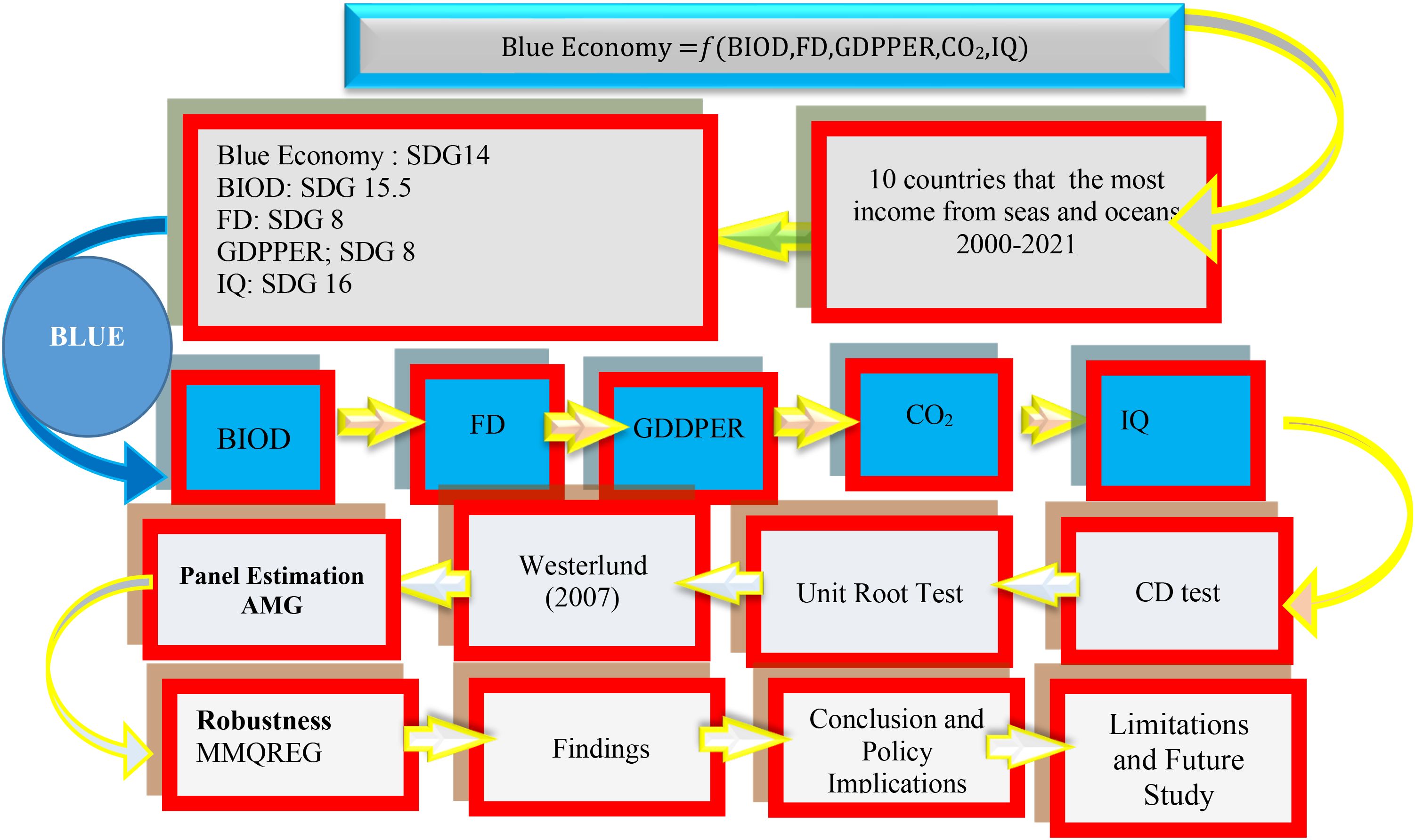The effective development and sustainability of the blue economy are closely linked to a range of ecological, economic, and institutional factors. Among these, biodiversity plays a central role in maintaining the resilience and productivity of marine ecosystems, which directly support fisheries, aquaculture, and coastal tourism. A rich and balanced marine biodiversity is essential for the long-term sustainability of the natural resources on which the blue economy depends (Pimentel et al., 1997). Equally important, financial development facilitates investment in sustainable marine infrastructure, fisheries technology, and environmental protection initiatives, enabling economies to better capitalize on marine resources while preserving ecological balance (Nham and Ha, 2023). In addition, institutional quality determines the effectiveness of marine governance, environmental regulation, and the enforcement of sustainable practices, which are critical for managing shared ocean resources and mitigating risks associated with overexploitation and pollution (Hossain et al., 2024). On the other hand, CO2 emissions represent a major environmental pressure on marine ecosystems, contributing to ocean acidification, rising temperatures, and biodiversity loss, all of which can undermine the productivity and sustainability of blue economy sectors. Finally, GDP per capita reflects the broader economic development level of a country, influencing both the demand for marine-based goods and services and the capacity to invest in sustainable resource management (Petrea et al., 2021). Examining the dynamic relationships among these factors within the blue economy framework offers valuable insights for promoting inclusive, resilient, and environmentally sustainable growth in alignment with the objectives of SDG 14.