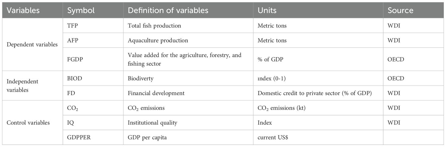 In parallel with the definition of the blue economy, the development of measurable indicators to monitor and evaluate the performance of the blue economy has been discussed. In this context, production-based and value-added indicators have come to the fore in the literature. These indicators include total fish production (TFP), aquaculture production (AFP), value added for the agriculture, forestry, and fishing sector (FGDP) (Alharthi and Hanif, 2020; Hossain et al., 2024; Ahammed et al., 2025). These indicators represent both the economic output of the blue economy and provide information on the sustainability and resilience of the marine ecosystem. For example, while TFP is an important component of the blue economy for food security and biodiversity conservation, AFP offers an alternative to traditional fishing practices. Similarly, FGDP serves as a broader economic indicator to assess the contribution of natural resource-based sectors, including marine activities, to national economies.