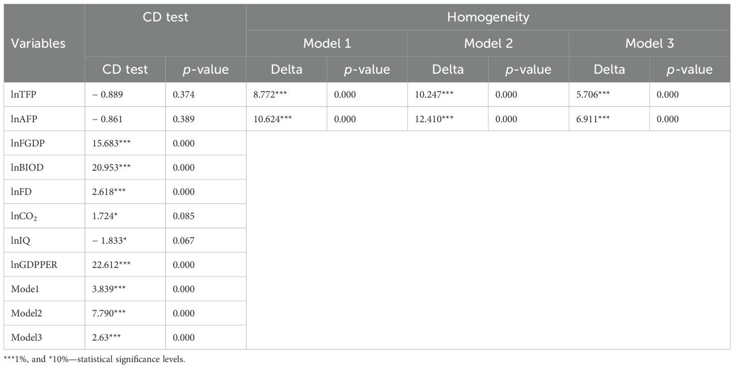 In panel data analysis, it is very important to conduct CD tests for both the series and the model. Because the effect of a shock (crisis, flood, fire, etc.) that may occur in one country is likely to affect other countries. Therefore, the results of a study conducted without checking the CD may be biased. In this context, in this study, the CD in the series and models is tested by means of the LM test and reported in Table 1. The results in Table 1 reveal that the null hypothesis of no CD is rejected for all variables except lnTFP and lnAFP. In other words, except for these two variables, the variables considered in the study have CD. Moreover, the results in Table 2 show that CD is also present in the errors obtained from the long-run equation of models 1, 2, and 3. Finally, the homogeneity assumption is also tested for all three models in Table 2, and the null hypothesis of no homogeneity is rejected in all models. Therefore, there is heterogeneity for all models, and appropriate long-run estimators should be selected.