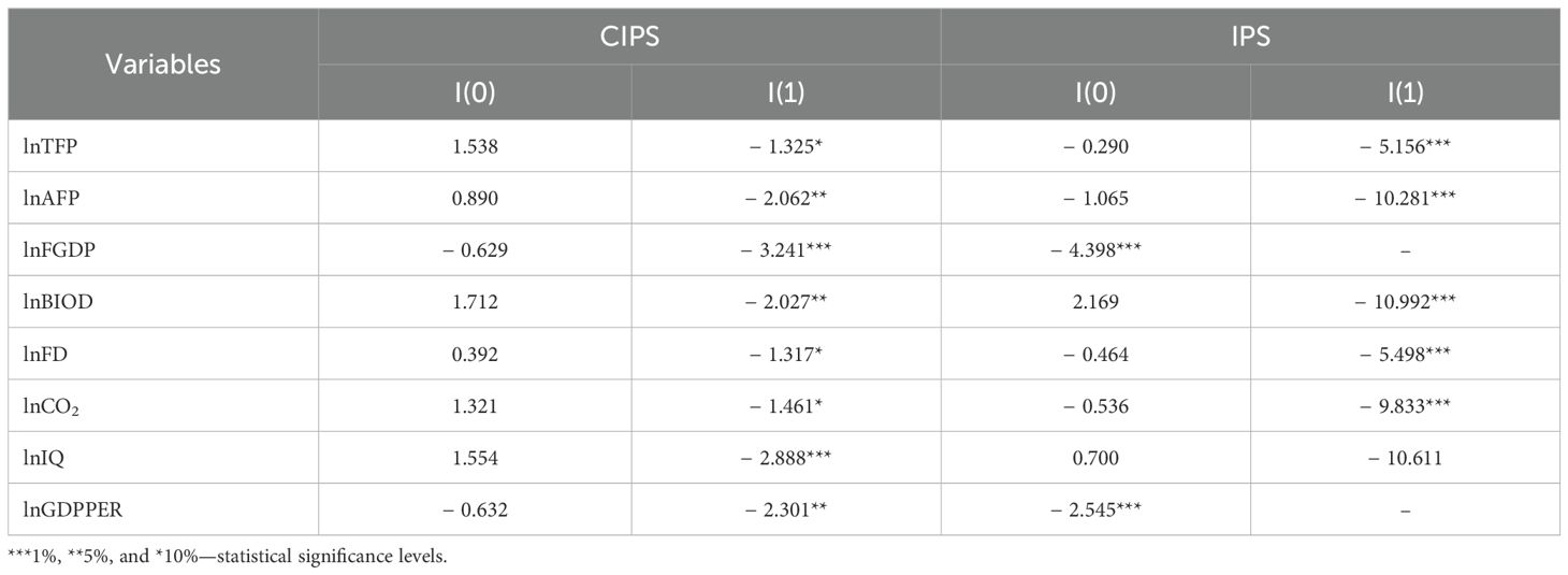 CADFi shows the average of the expanded ADF statistics for each slice. The null hypothesis of the CIPS test is “there is a unit root (the series is not stationary)”, and the alternative hypothesis is “there is no unit root (the series is stationary)”. Critical values for this test are tabulated by Pesaran (2007). These tabulated critical values are compared with the CIPS test statistics to determine whether there is a unit root in the series.