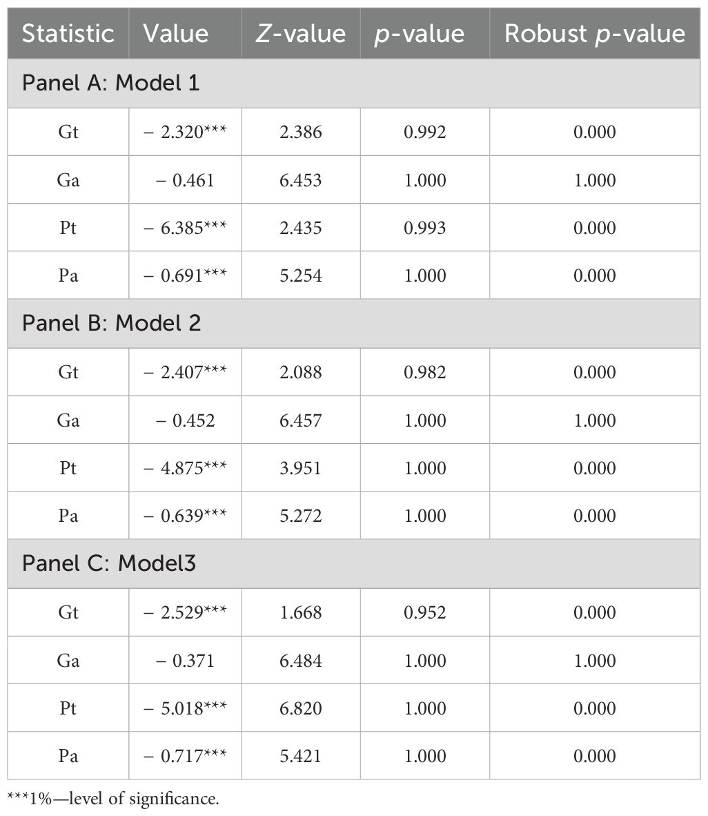 For both test groups, the null hypothesis is expressed as “there is no cointegration”, while the alternative hypothesis is expressed as “there is cointegration”. If the panel shows heterogeneity, it is more appropriate to rely on group statistics, while if it is homogeneous, panel statistics should be given more credence.