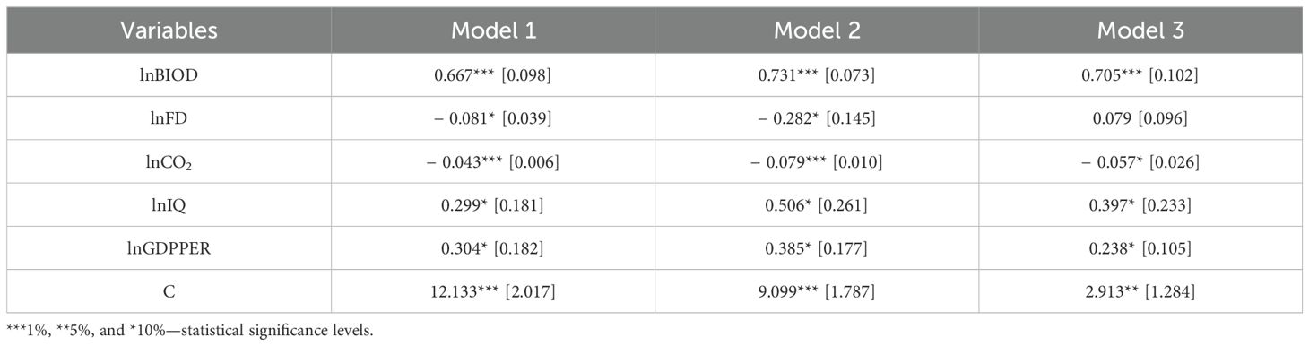 Finally, the results of model 3 in Table 5 show that all independent variables, except lnFD have a significant long-run effect on the dependent variable lnFDGDP. Accordingly, in the long run, a 1% increase in lnCO2 decreases lnFGDP by 0.057%. In addition, the long-run results reveal that lnBIOD, lnIQ, and lnGDPPER positively affect lnFGDP by 0.705%, 0.397%, and 0.238%, respectively.