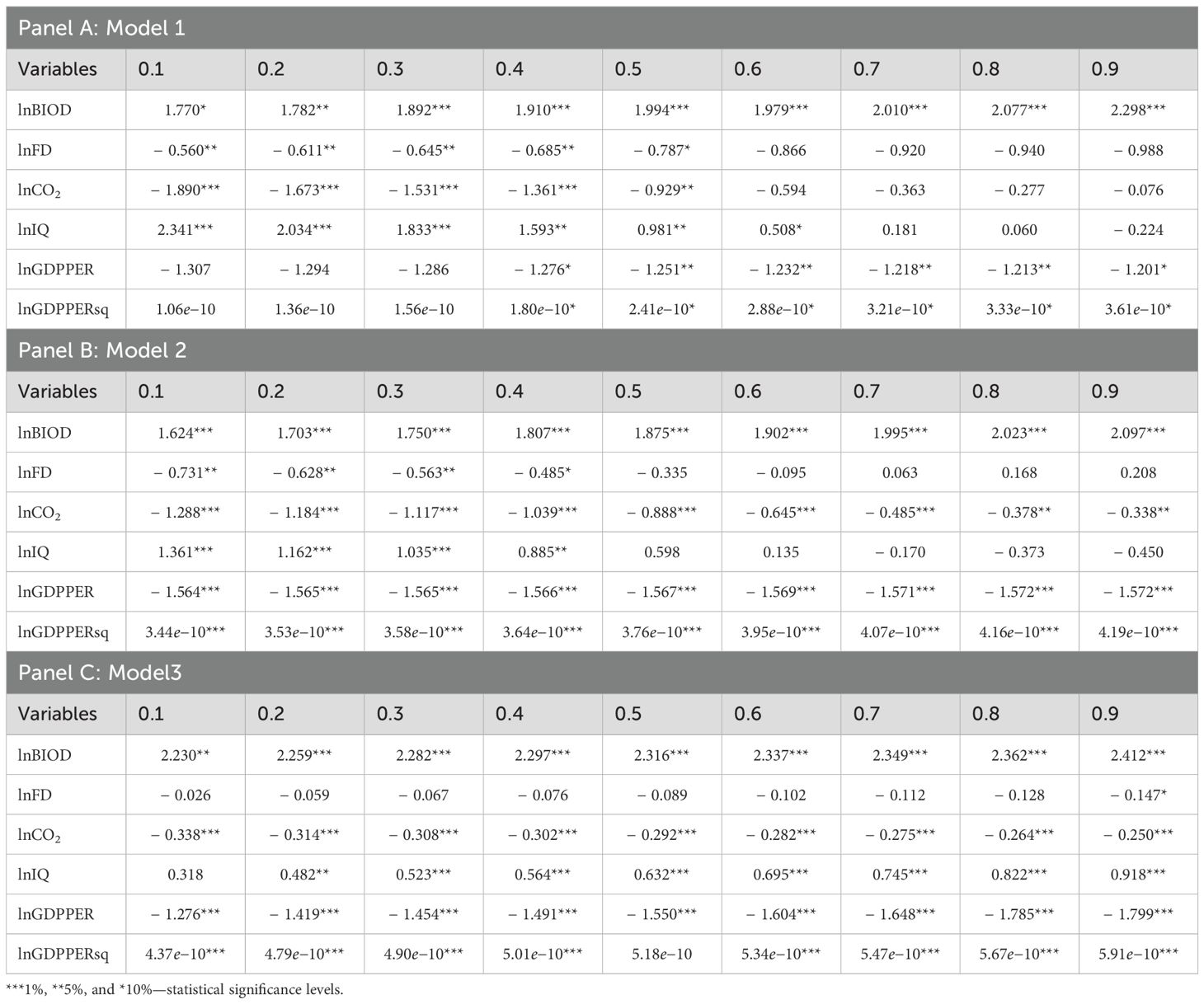According to the results of model 1 presented in panel A of Table 6, the lnBIOD variable has a positive effect on lnTFP in all cartels, and this effect increases gradually in high cartels. The effect of lnFD on lnTFP is negative and significant in low cartels and negative but statistically insignificant in high cartels. lnCO2 and lnGDPPER variables have a negative and statistically significant effect on lnTFP in all cartels. Finally, lnIQ has a positive and statistically significant effect on lnTFP in low quartiles, while lnGDPPERsq is positive and statistically significant in all quartiles. This finding also shows that there is an inverted U-shaped relationship between GDPPER and blue growth. It is observed that the independent variables have similar effects for the model 2 dependent variable lnAFP in panel B and the dependent variable lnFGDP in model 3 in panel C presented in Table 6. Accordingly, the findings obtained from the AMG estimator for all three models are supported by the findings obtained from the MMQREG approach, implying that the estimation results are consistent.