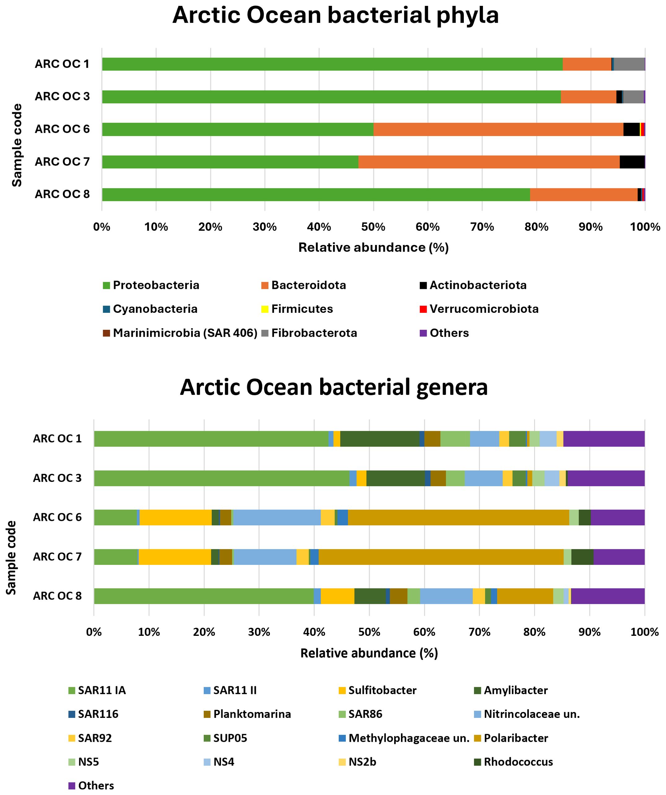 The relative abundances of bacterial phyla and genera detected in the Arctic Ocean are shown in Figure 2. The phyla Proteobacteria and Bacteroidota accounted for more than 90% of the relative abundance. Fibrobacterota and Actinobacteriota were also present with relative abundances of approximately 6% in the samples that were richer in these two minority phyla (ARC OC 1 and ARC OC 7, respectively). Cyanobacteria were only present in traces in some of these samples. At the genus level, the predominance of the SAR11 clade Ia was characteristic of samples ARC OC 1, ARC OC 3, and ARC OC 8. In the northern most samples ARC OC 6 and ARC OC 7, the genus Polaribacter, belonging to the phylum Bacteroidota, was predominant with a relative abundance of more than 40%. The highest relative abundance for the genus Sulfitobacter was found in the sample ARC OC 7 (13.2%) and ARC OC 6 (13.1%), while the lowest was found in ARC OC 1 (1.2%). The Nitrincolaceae were consistently present in the analysed samples, with percentages ranging from ~5% to ~16%, with the highest percentages observed in the ARC OC 6 and 7 samples. The genus Rhodococcus, belonging to the family of Nocardiaceae, detected in samples ARC OC 3-6-7 and 8, had the highest relative abundance in sample ARC OC 7 (4%).