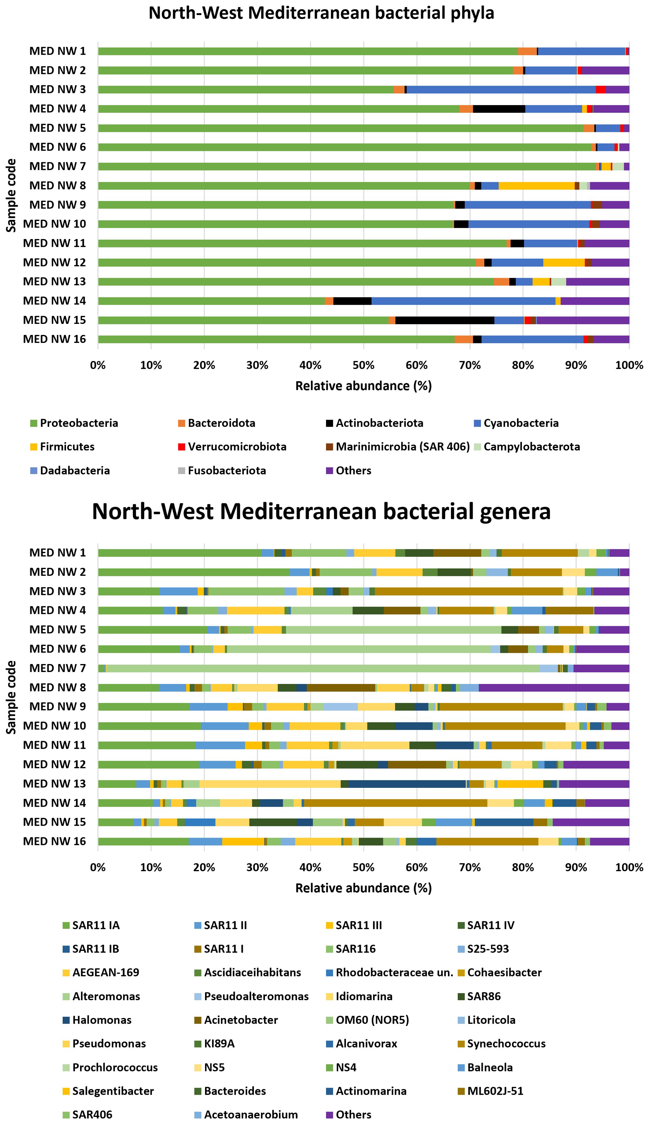 At the phylum level, the NW Mediterranean Sea was dominated by Proteobacteria, which accounted for more than 90% of the total population in some samples (MED NW 5, 6, and 7) (Figure 3). The second most abundant phylum was Cyanobacteria, with the highest percentages found in samples MED NW 3 (35.6%) and MED NW 14 (34.6%).