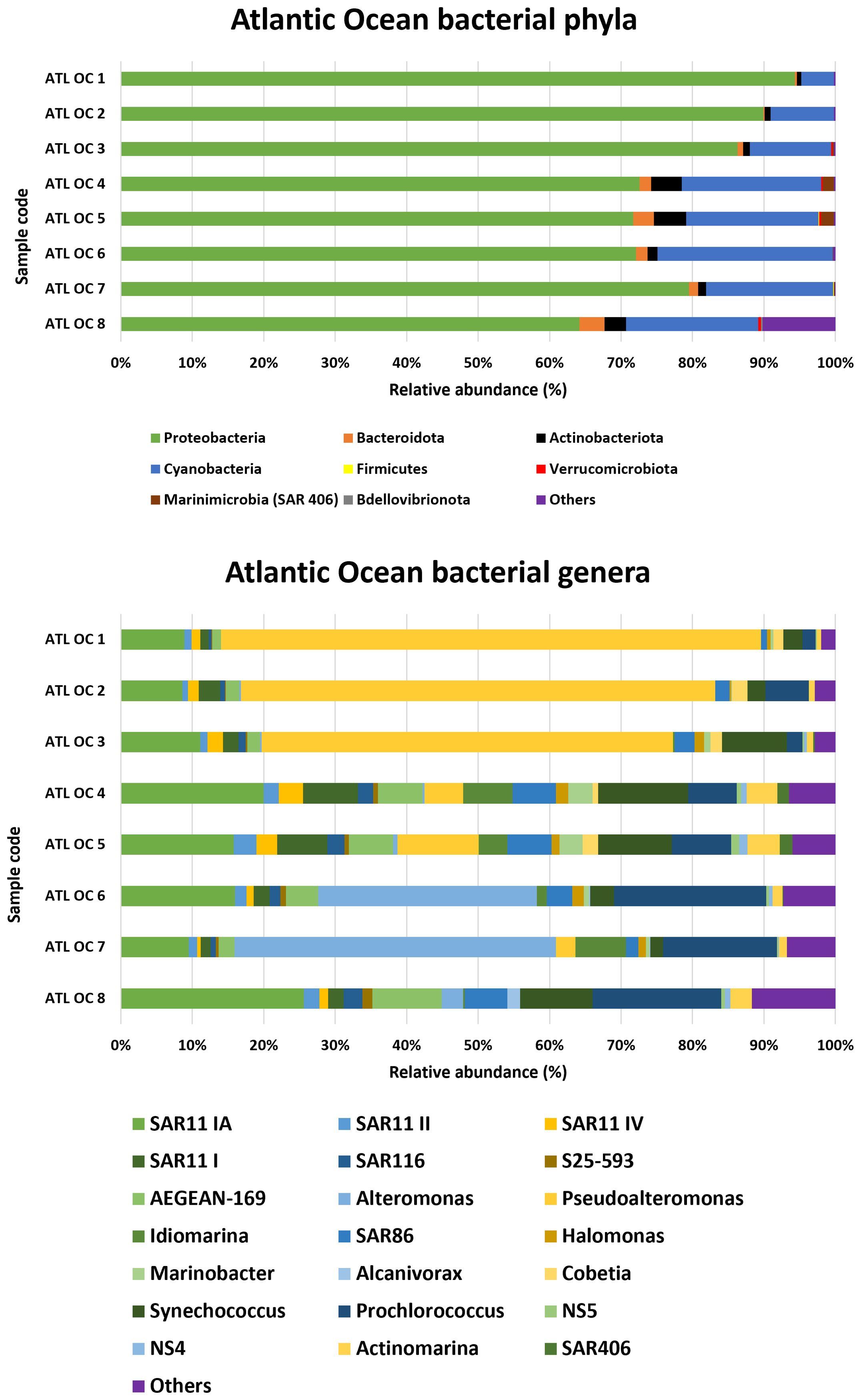 In the Atlantic Ocean samples (Figure 5), Proteobacteria was the most abundant phylum, with the highest proportion observed in ATL OC 1 (94.3%) and the lowest in ATL OC 8 (64.2%). Cyanobacteria was the second most prevalent phylum, with a maximum relative abundance recorded in ATL OC 6 (24.5%) and a minimum in ATL OC 1 (4.6%). The Marinimicrobia (SAR 406) phylum was present in small but notable proportions, particularly in ATL OC 4 and ATL OC 5, with values of 1.6% and 1.8% respectively. At the genus level, Synechococcus was found consistently among the most abundant cyanobacterial genera across Atlantic samples, although its relative abundance varied markedly among stations, peaking at ATL OC 4 (12.6%) and ATL OC 5 (10.3%), and showing lower levels at ATL OC 7 (1.8%). Pseudoalteromonas reached a high relative abundance in ATL OC 1 (75.6%), where it represented a dominant component of the community. Alteromonas was also well represented across multiple sites, particularly in ATL OC 7 (45%) and ATL OC 6 (30.6%). Additional genera, such as SAR11 clade Ia, Prochlorococcus and AEGEAN-169 marine group were recurrently detected and contributed to the overall diversity.
