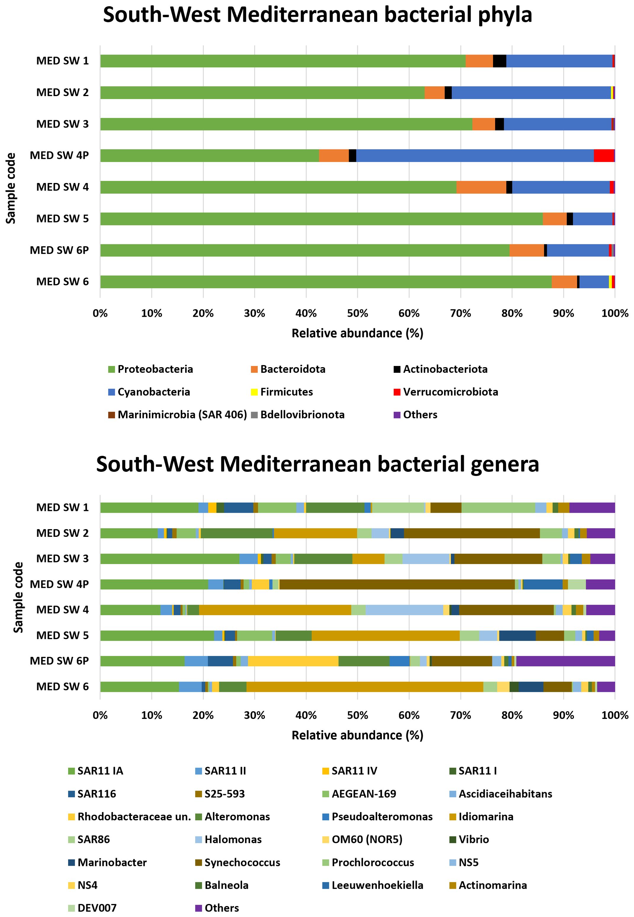 The analysis of bacterial phyla in the southwestern Mediterranean is shown in Figure 4. Proteobacteria were the dominant phylum in all samples, with relative abundances ranging from 42.5% in the MED SW 4P sample to 88% in MED SW 6.