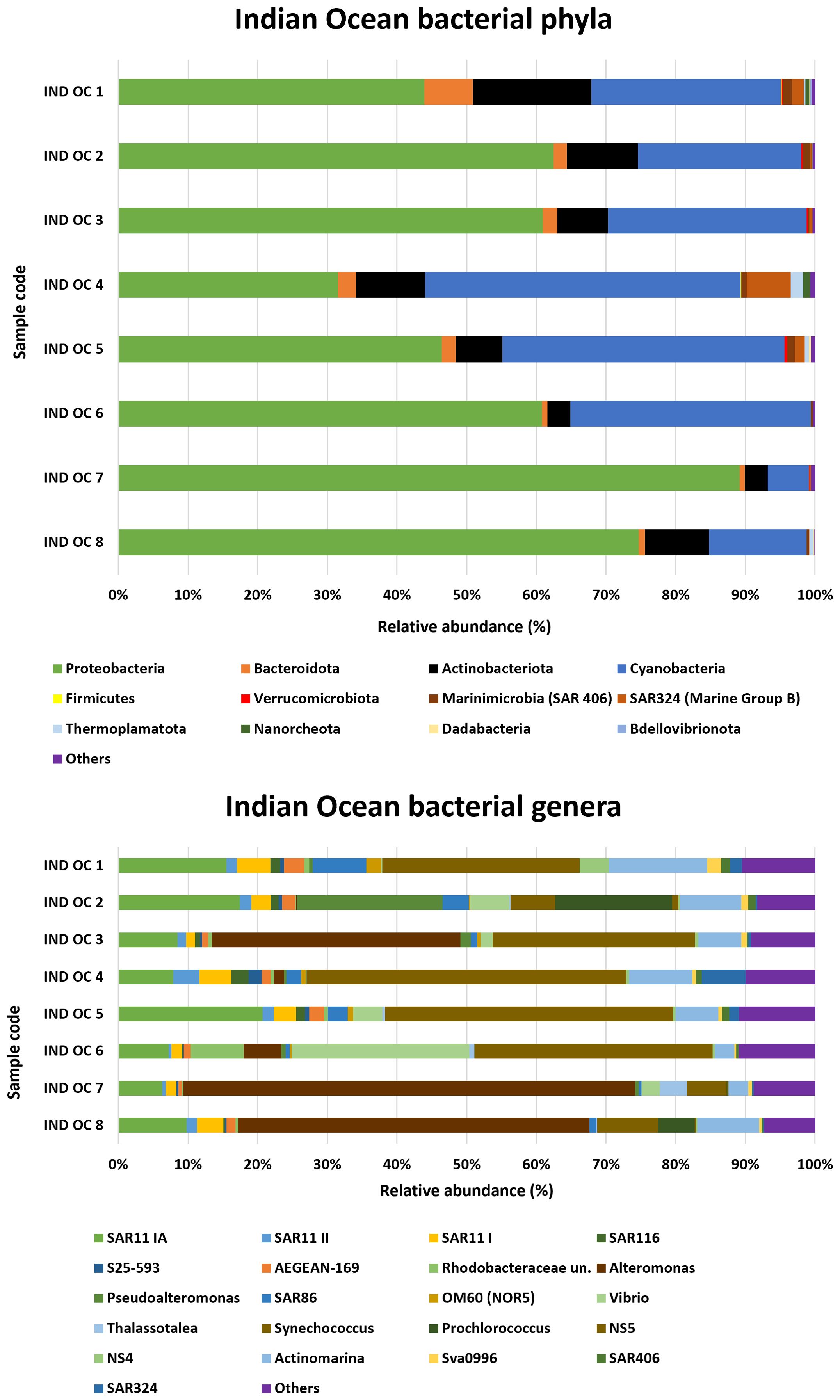 Proteobacteria abundance ranged from a high of 89.2% in IND OC 7 to a low of 31.5% in IND OC 4. Analysis of bacterial genera in the Indian Ocean samples revealed the occurrence of SAR11 clade I, SAR 11 II, and SAR 11 IV (the latter less than 1%) across all samples.