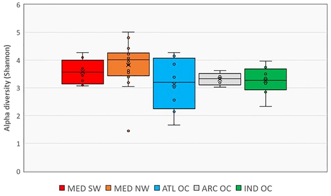 The Atlantic Ocean showed the broadest variability in Shannon values across sites, as reflected by the large interquartile range. While some samples had high diversity, the median value was comparable to MED SW but lower than MED NW.