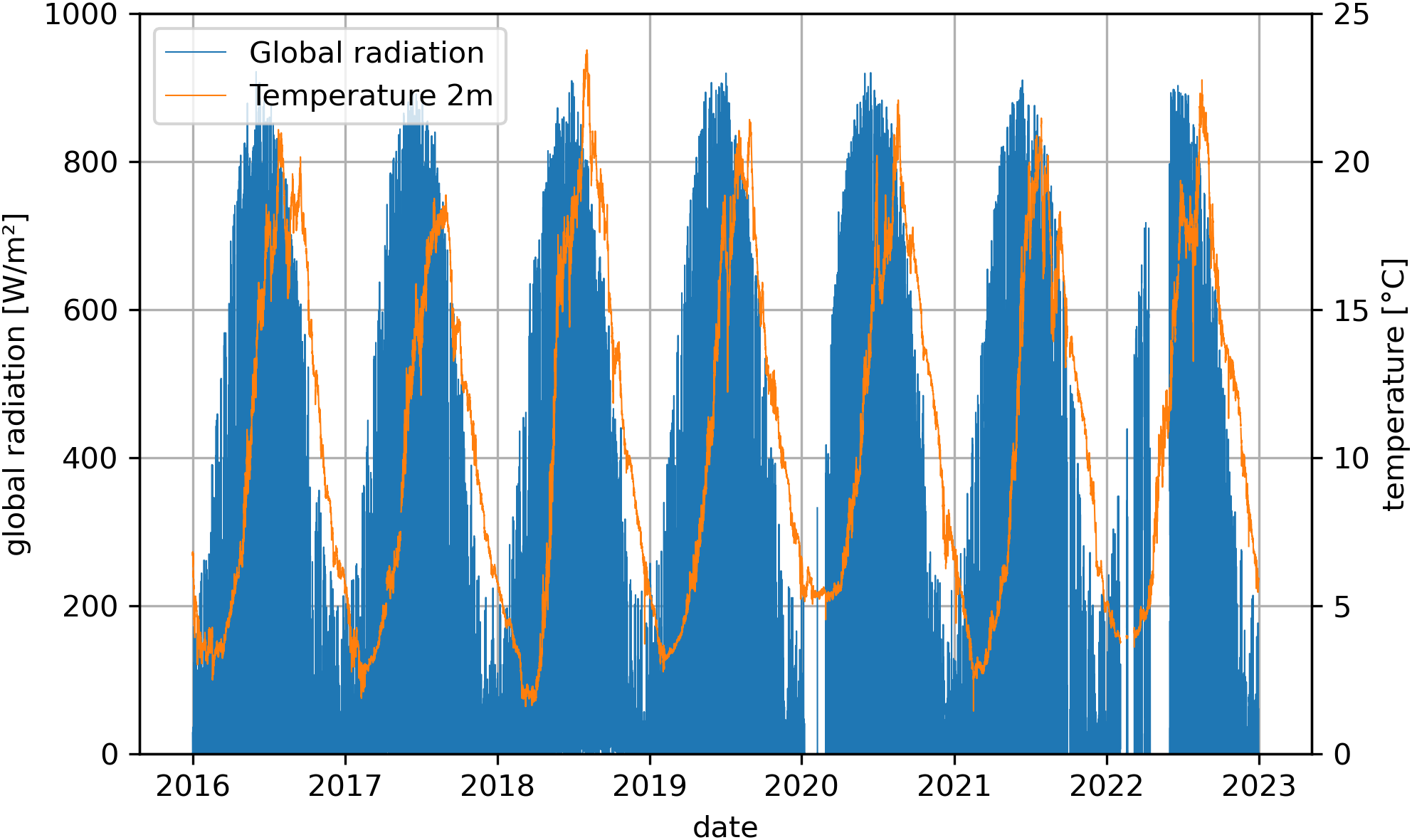 In order to evaluate antifouling technologies a region with high productivity is needed. Former nutrient input to the Baltic Sea, having its maximum in the 1980s, increased the net ecosystem production by a factor of 2.5 compared to the 1920s – 1930s (Schneider et al., 2015). The growth behavior of biomass in the coastal western Baltic Sea area changes with huge interannual variability in taxa and abundance and a trend towards longer growing seasons (Wasmund et al., 2019). Besides that the primary production increased fourfold in the 1997–2006 period compared to 1947–1956 period (Gustafsson et al., 2012). This productivity is expected to remain at that level if there is no further reduction of phosphorus input. In the 2016–2023 period mean temperature in 2 m water depth was 10.68°C, varying between 1.43°C and 23.77°C. Maximum global radiation in that period was 921 W/m² (Figure 1). The high productivity and its availability of long-term operated platforms, therefore makes the Baltic Sea a well-suited environment for evaluating antifouling technologies.