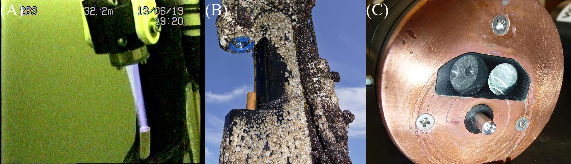 According to the UVC emitter presented in (Bueley et al., 2014) (AML cabled UV, 12 V, 120 mA, 3 mW radiant flux) efficiency of the here presented system is 20 times larger, the same radiant flux can be emitted using only 5% of the electrical energy. The IOW remotely operated vehicle was able to take a picture of the focused beam of the UVC emitter (Figure 2A). The antifouling effect of the emitter being installed on a SBE37 after 10 weeks in coastal Baltic Sea water is clearly visible with areas being kept free of biofouling (Figure 2B).