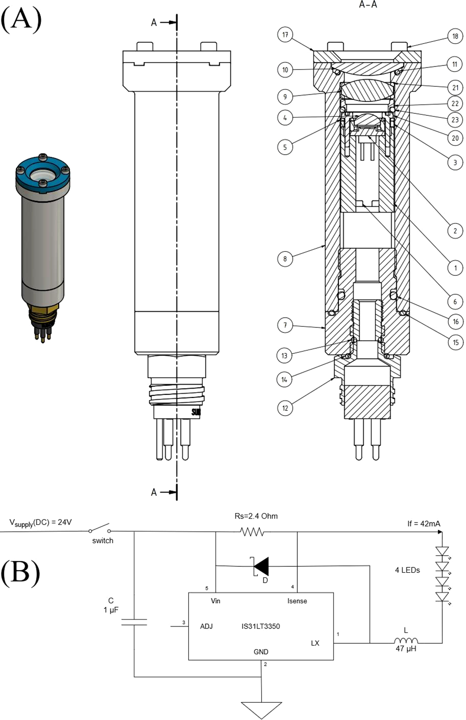 Schematic view of the focused UVC emitter. A LED (2) and three fused silica lenses (4, 9, 10) are mounted in a titanium housing with a wet pluggable connector (A). The schematic diagram of the electronic assembly is shown in (B).