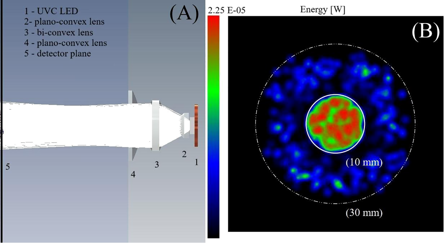 The optical setup with UVC LED on the right, lenses in the middle and detector on the left-hand side and modeled rays is presented in (A). The distribution of rays on the detector plane in a distance of 100 mm from the LED is shown in (B). Note the focus of rays in the inner 10 mm circle and only scarce appearance of rays outside that inner circle.