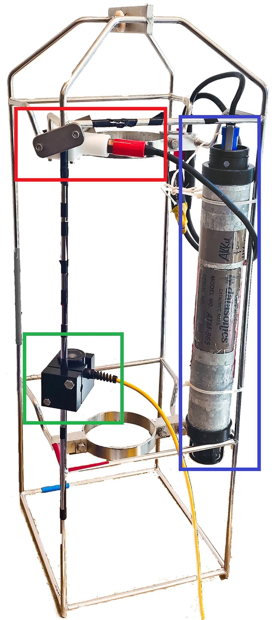 The cage houses the lens-free UVC emitter (red box), detector (green box) and battery pack with on/off switch (blue box). For testing purposes, the cage is mounted on the CTD rosette.