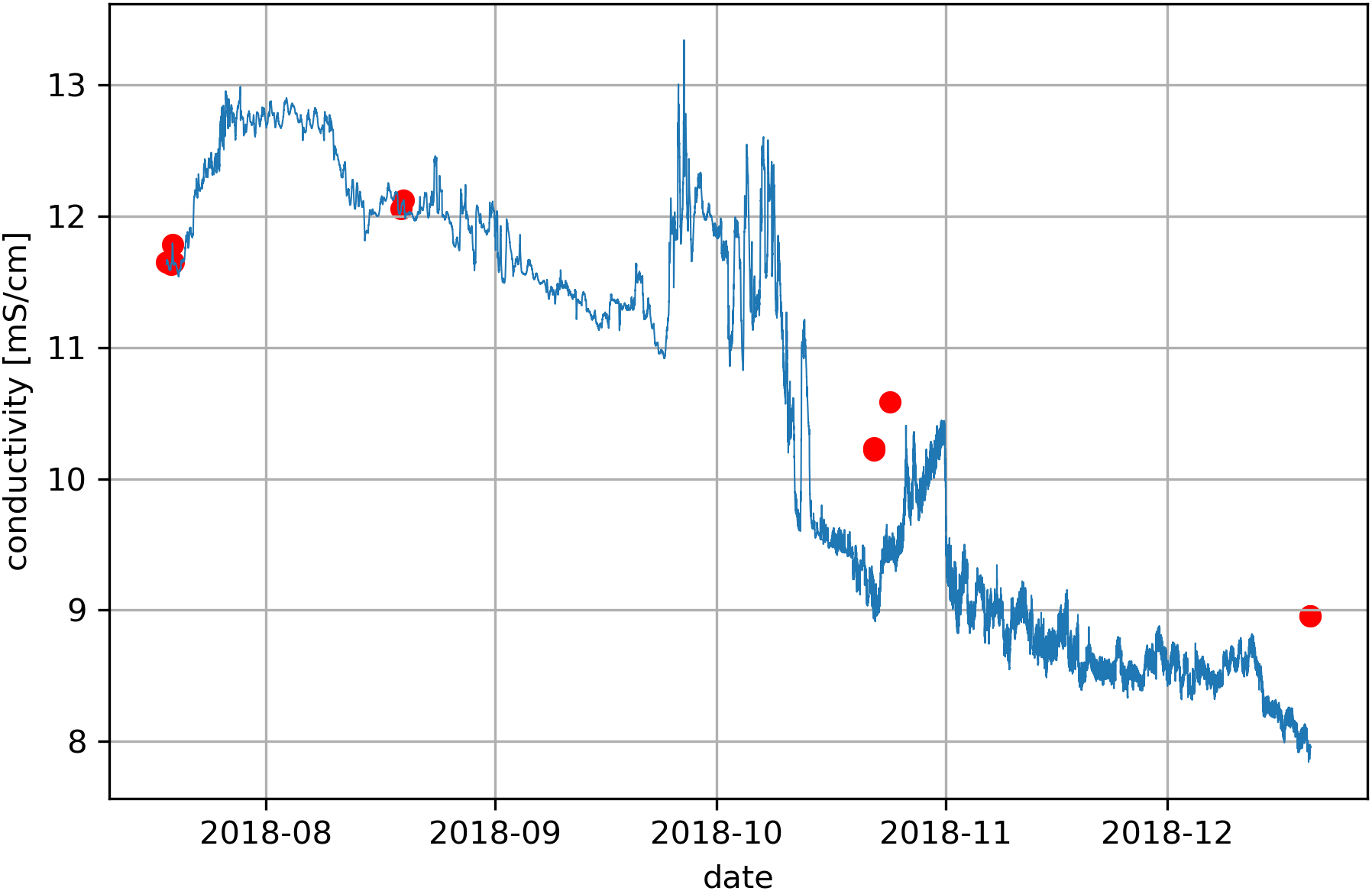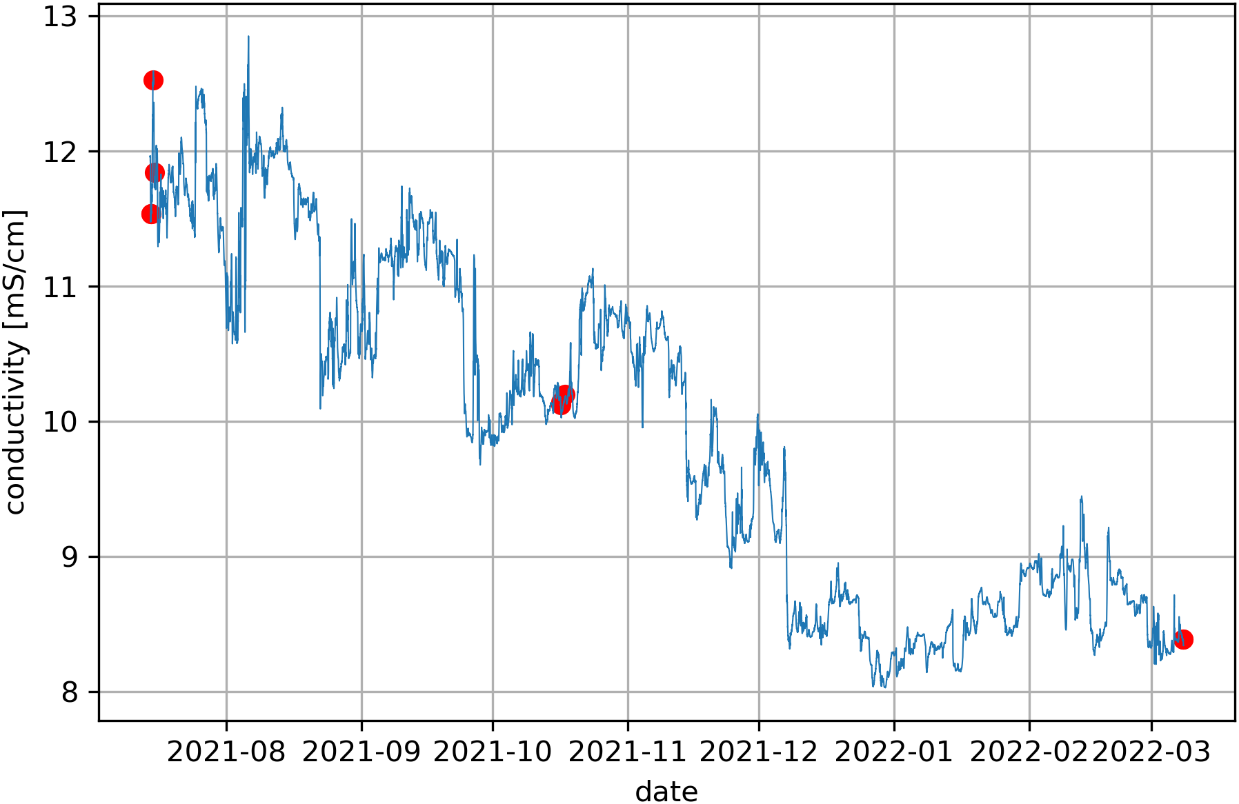 Conductivity data from a standard SBE37 deployment in 2m water depth in coastal Baltic Sea water. Red marker points represent reference measurements with the shipboard SBE 911plus.