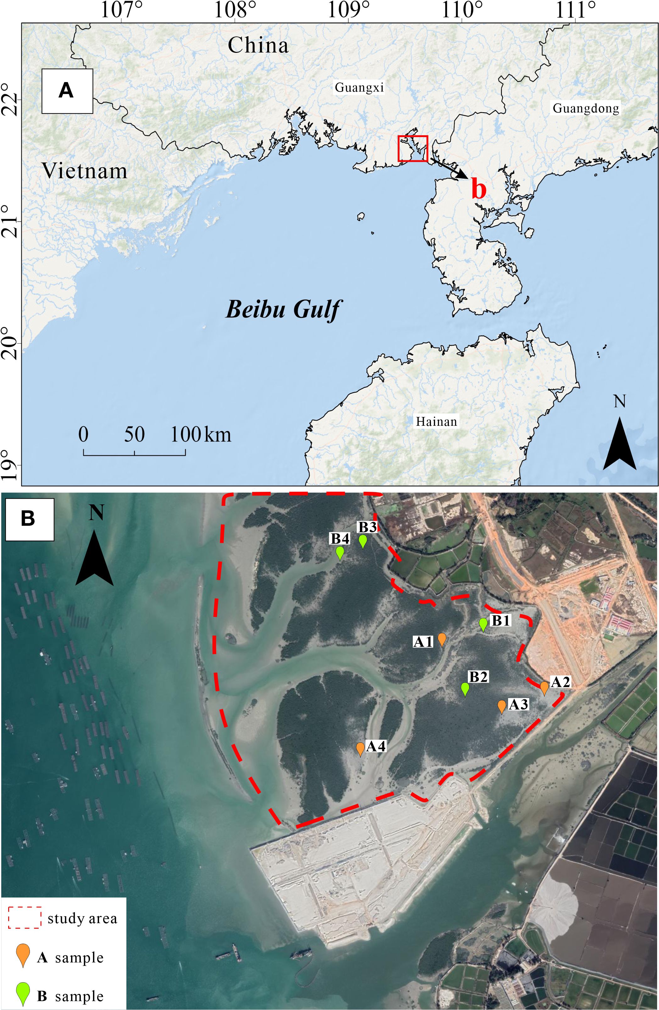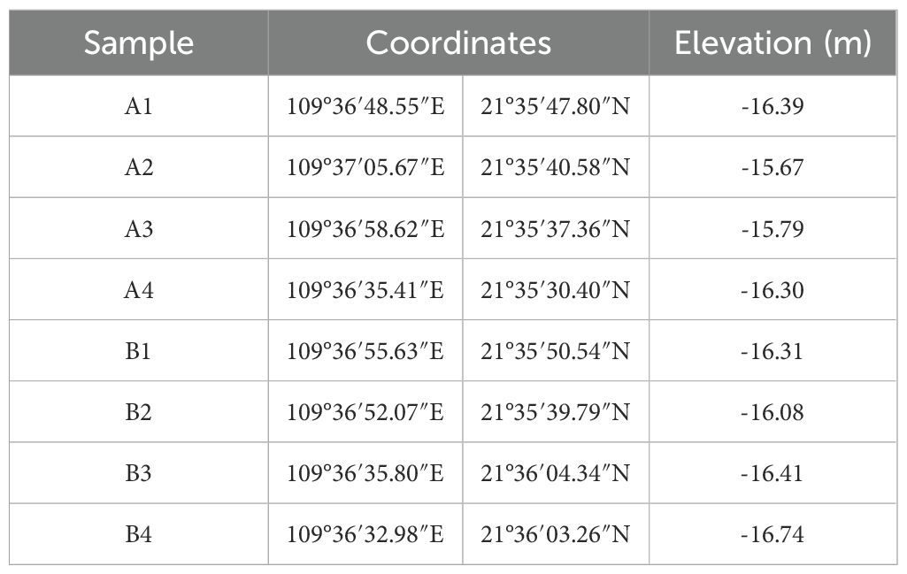 In this study, the sample collection was not conducted strictly following a linear sampling method; rather, it was based on random sampling triggered by observing situations where mangrove plants were thriving or exhibiting distinct mortality during the field investigation. Sampling sites were stratified by vegetation vigor: areas exhibiting robust mangrove growth were classified as degraded (Area A, n = 4), while areas displaying partial mortality of both saplings and mature trees were designated preserved (Area B, n = 4). A total of 8 sediment cores (50 cm in length) were collected from these areas(Figure 1), and the elevation at each sampling location was measured (Table 1). Core collection employed a modified peat corer to ensure intact stratigraphic sequences, with vertical subsampling guided by a density-optimized protocol: surface sediments (0–20 cm depth) were sectioned at 5 cm intervals, transitioning to 10 cm intervals below 20 cm. All samples were immediately sealed in sterile polyethylene bags, stored at 4°C in lightproof containers, and transported under chain-of-custody protocols to minimize biogeochemical alterations prior to laboratory analysis.