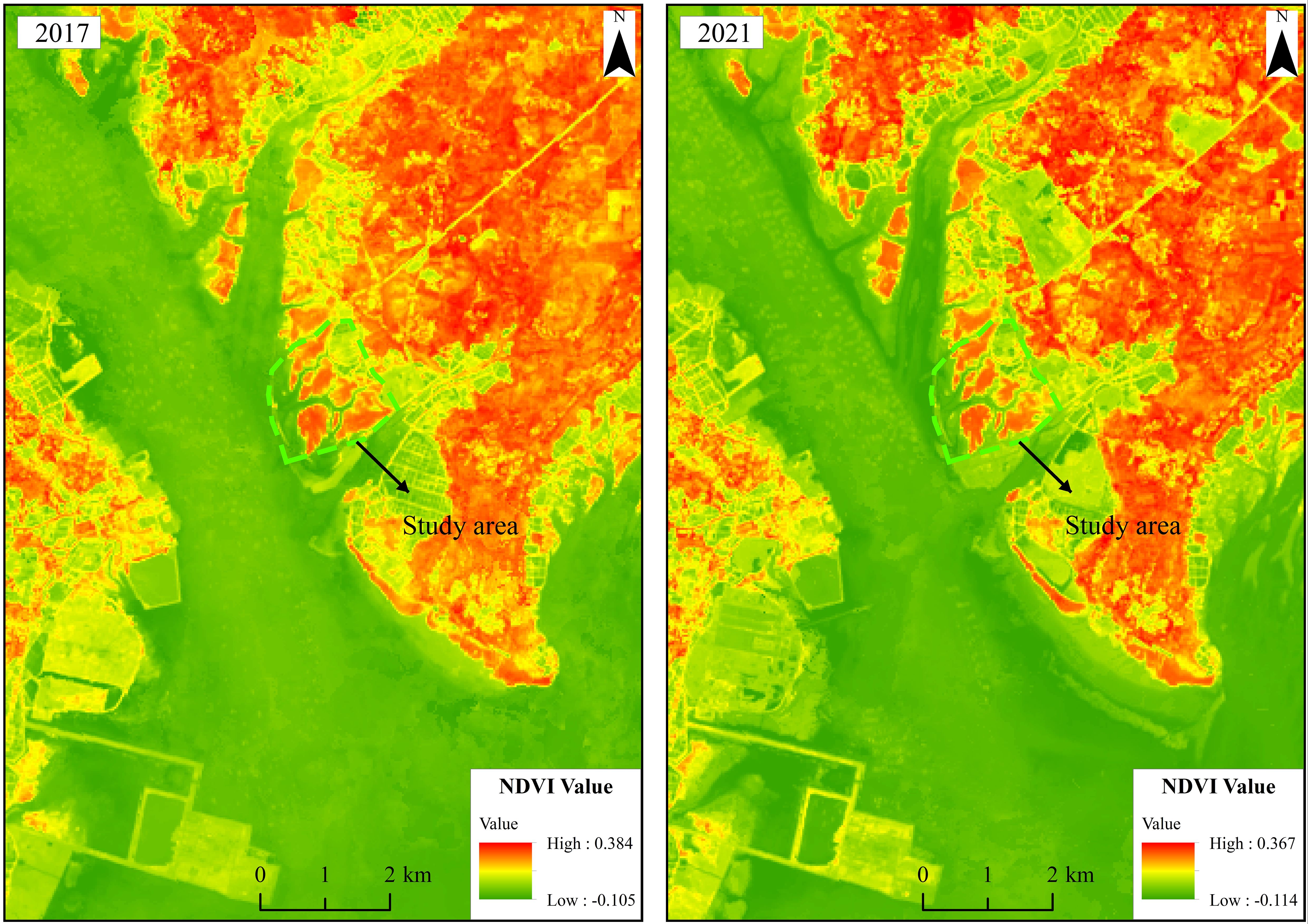 Tieshangang Bay, a semi-enclosed basin elongated meridionally in the northeastern Beibu Gulf, spans a 170 km coastline and encompasses 340 km² of aquatic domain. This geomorphologically privileged system combines extensive tidal prism dynamics (tidal range reaching 5 m), favorable bathymetric conditions (maximum depth >20 m), and low-wave-energy regimes, synergized with abundant hinterland resources, positioning it as a strategic deep-water port development zone in southwestern China. The research area is situated within Beihai City’s predominant industrial cluster, hosting established facilities for photovoltaic production, mineral processing, and pulp and paper manufacturing. A series of port infrastructures have been developed along both shores of the embayment, with ongoing expansion projects to enhance its role as a regional maritime logistics hub. Extensive typical mangrove communities thrive across the intertidal zones flanking Tieshangang Bay, forming critical ecological barriers. Dominant species include Avicennia marina, Aegiceras corniculatum, and Rhizophora stylosa. Canopy heights are generally below 3.5 m, predominantly ranging from 2–3 m, with a mean diameter at breast height (DBH) of 12 cm. Notable growth disparities were observed among mangrove stands: while some sectors exhibit vigorous development, others display stunted growth accompanied by mortality events affecting both saplings and mature trees. Comparative analysis of Landsat imagery (pre-construction [2017] vs. post-construction [2021]) revealed a marked NDVI reduction in the eastern study area during 2021, field-verified through ground observations. This decline prompted investigation into its causal attribution (Figure 2).