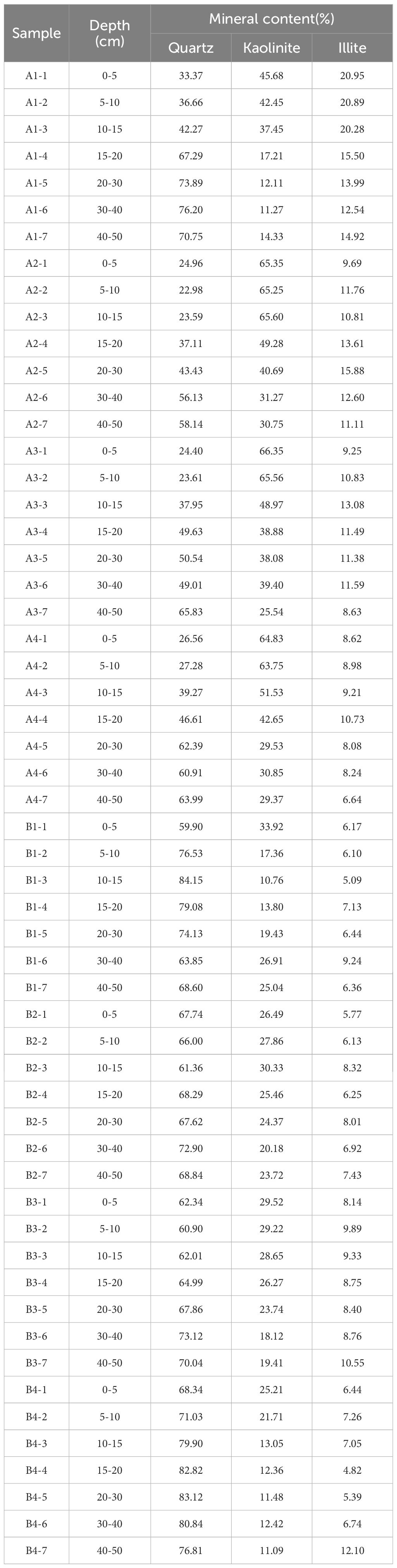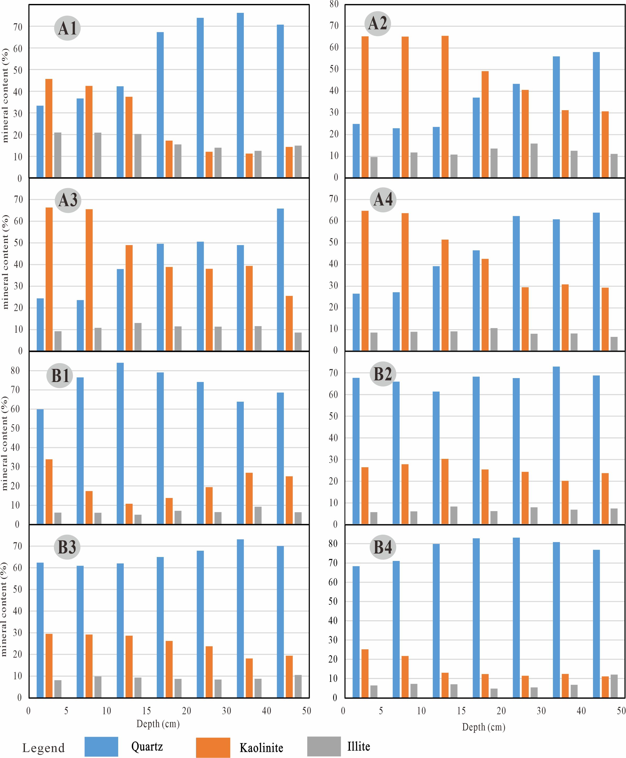 Kaolinite characteristics: A significant enrichment layer (48.97% - 66.35%) is formed in the surface 0–15 cm, with a content as high as 66.35% in A3 core sample 0–5 cm. With the increase in depth, the kaolinite content shows an exponential attenuation trend. The content in the 15–20 cm layer of A1 core sample decreased by 62.3% (from 45.68% to 17.21%). Notably, A2 - A4 core samples still maintained a content of > 30% below 20 cm, while the content in the 20 cm below of A1 core sample dropped sharply to < 15%.