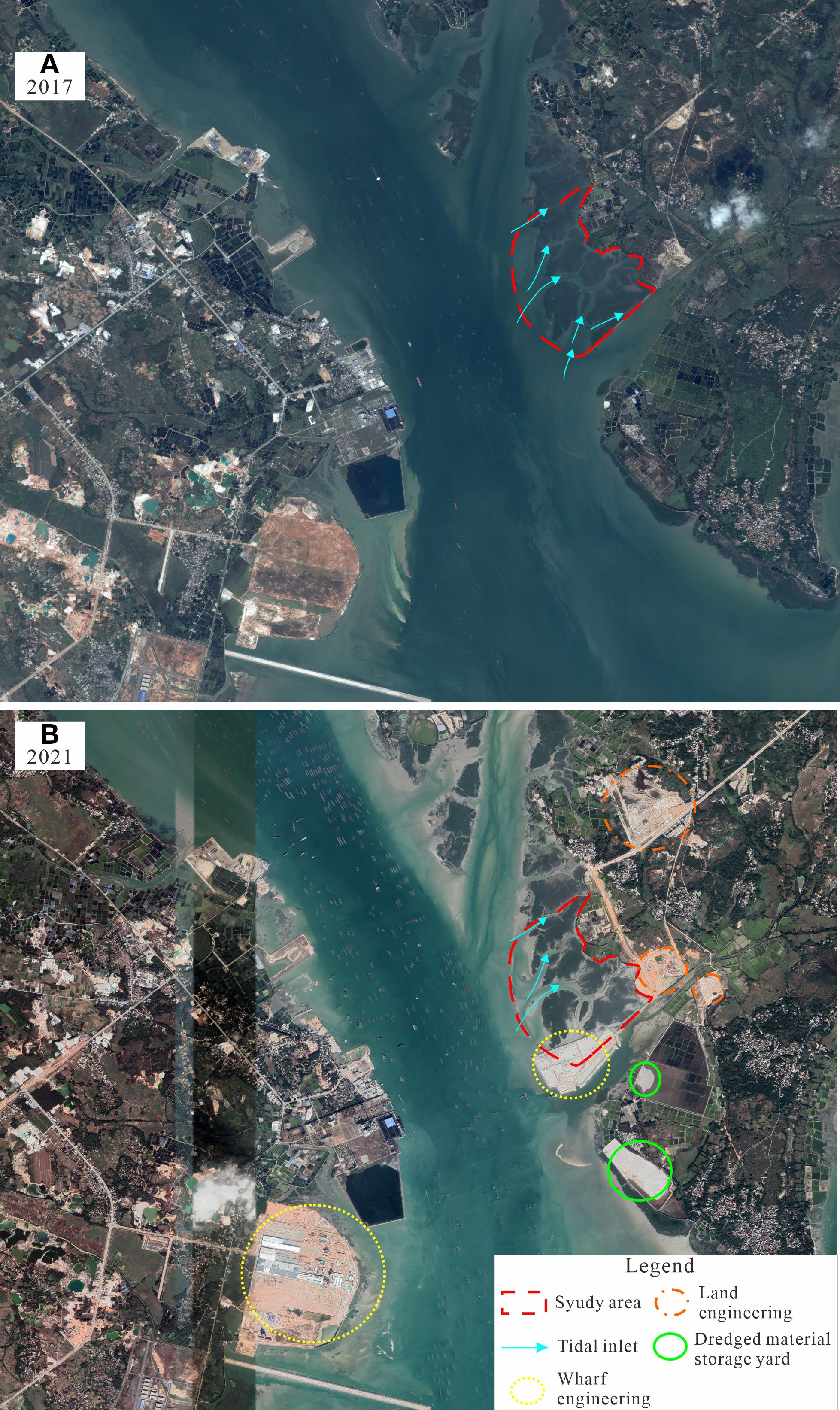 Tieshangang Bay constitutes a large semi-enclosed embayment in the northwestern Beibu Gulf. Its tidal hydrodynamics exhibit distinct characteristics modulated by astronomical tides, wind forcing, bathymetric constraints, and anthropogenic interventions. The system experiences a predominantly diurnal tidal regime featuring single flood-ebb cycles daily, though with noted irregularities in tidal range and phase. Tidal currents demonstrate canonical diurnal reversals, alternating between flood- and ebb-dominant phases over semi-diurnal intervals. 2017 imagery (Figure 6a) illustrates an intact tidal network with multiple southern/western channels enabling efficient marine flushing. By 2021 (Figure 6b), critical southern channels had been replaced by port infrastructure, restricting connectivity to two diminished northwestern conduits. This geomorphic alteration reduced tidal prism volume by ~65%, decreasing current velocities from 0.8-1.2 m/s to 0.3-0.5 m/s. The resultant shift from high-energy tidal regimes to low-energy lagoonal conditions (evidenced by increased water residence time from <12 hr to >36 hr) fundamentally altered sediment dynamics. Reduced hydrodynamic competence impaired both landward sediment transport during flood tides and seaward export during ebb phases, creating net depositional conditions for anthropogenically-sourced kaolinite.