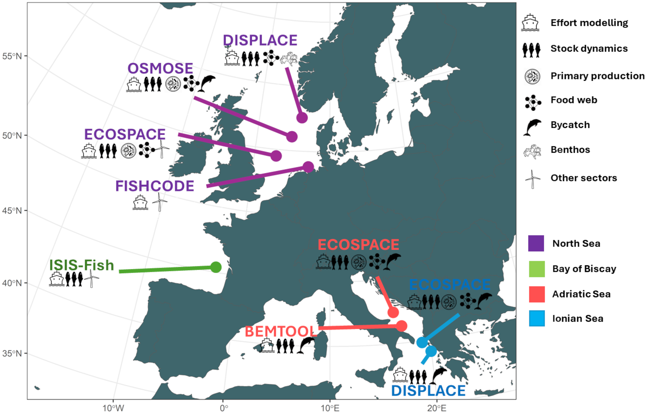 Different models and case studies across EU waters. See the description of the used models in Supplementary Materials. These models were ECOSPACE (Walters et al., 1999), OSMOSE (Shin and Cury, 2001), ISIS-Fish (Mahévas and Pelletier, 2003), DISPLACE (Bastardie et al., 2014), BEMTOOL (Rossetto et al., 2015), and FISHCODE (Letschert et al., 2025).