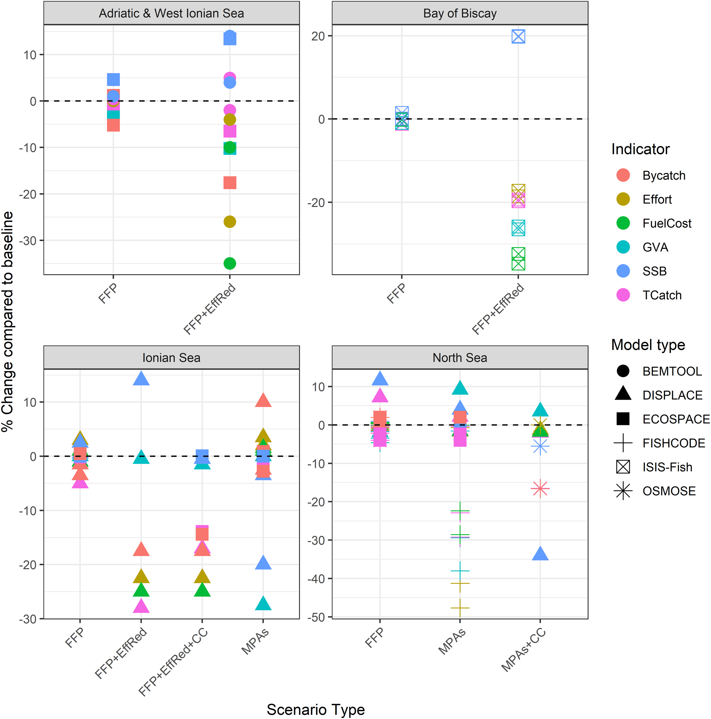 Percent change relative to the baseline run for each model type and case study, with FFP is the fit-for-purpose proposals for protection, contrasted against implementing restrictions in existing MPAs network, and EffRed an effort reduction implemented aside, and CC marking the climate change effect included. Fit for purpose were proposals aimed at protecting the Benthic community and habitats (delineating 30% around the higher Relative Benthic Status RBS areas), and delineating areas that are anticipated to reduce the risk of bycatch of sensitive species. Scenarios have been grouped by scenario type. Indicators are: Total effort, Total catch across all species, gross value added GVA, Fuel cost, spawning stock biomass SSB all species pooled, and bycatch weight caught. The impact is to some extent dependent on the closed surface area and the overlap with the ongoing fishing activities, which vary across scenarios, making variable the proportion of total effort that will be displaced. Note that not all model types have had time to run each scenario.