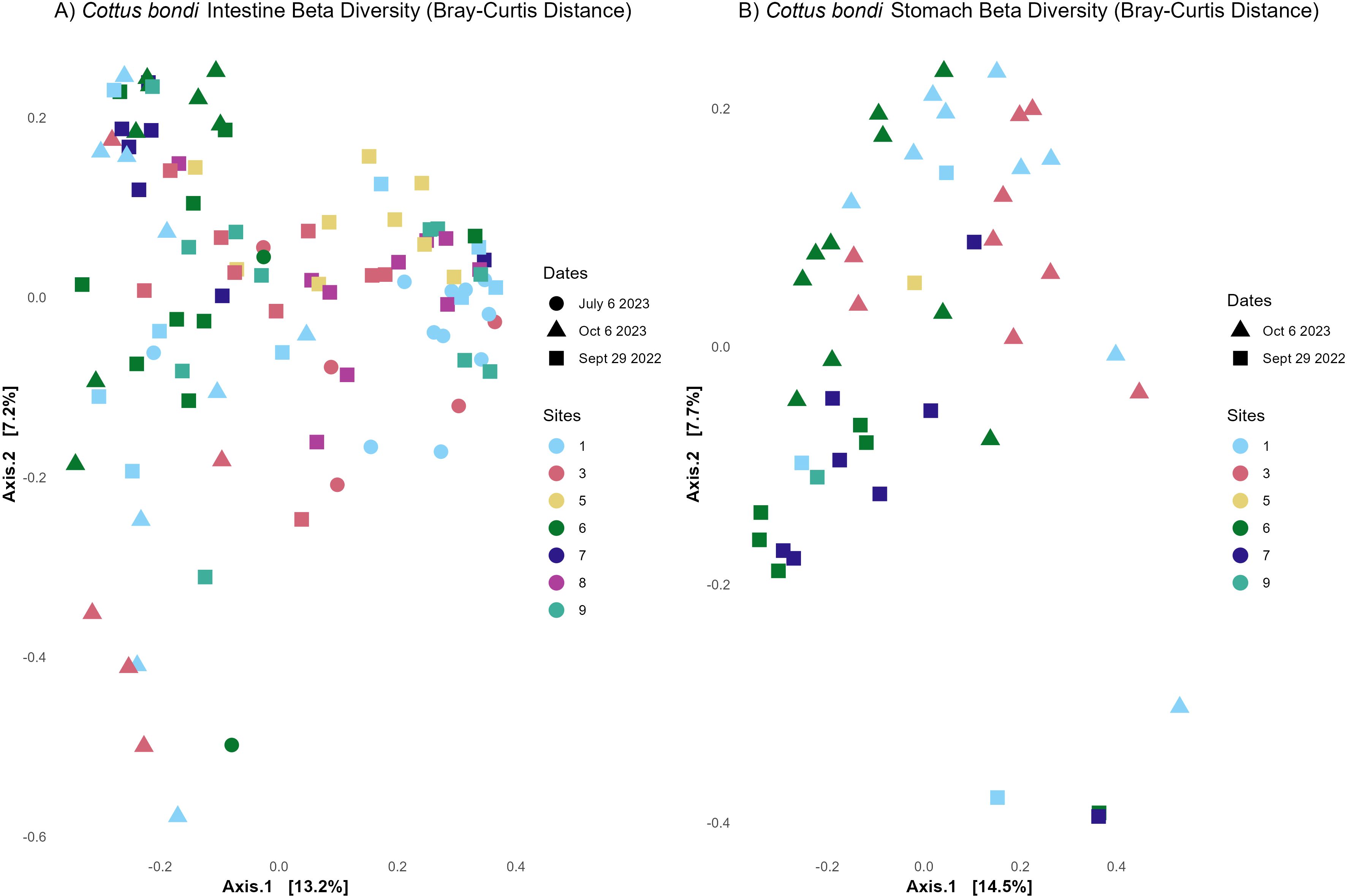 Figure 3. Beta diversity from microbial communities in the intestines and stomachs of Rocky Mountain Sculpin (Cottus bondi) collected at one site upstream the WWTP (Site 1) and multiple sites downstream the WWTP (sites 3-9) at East Gallatin River during the fall of 2022 and summer and fall of 2023. (A) Bray-Curtis distances for sculpin’s intestine showing significant differences in microbial community composition between sites (p=0.001, PERMANOVA) and dates (p=0.001, PERMANOVA) (B) Bray-Curtis distances for C. bondi stomachs showing significant differences in microbial community composition between sites (p=0.002, PERMANOVA) and dates (p=0.008, PERMANOVA).