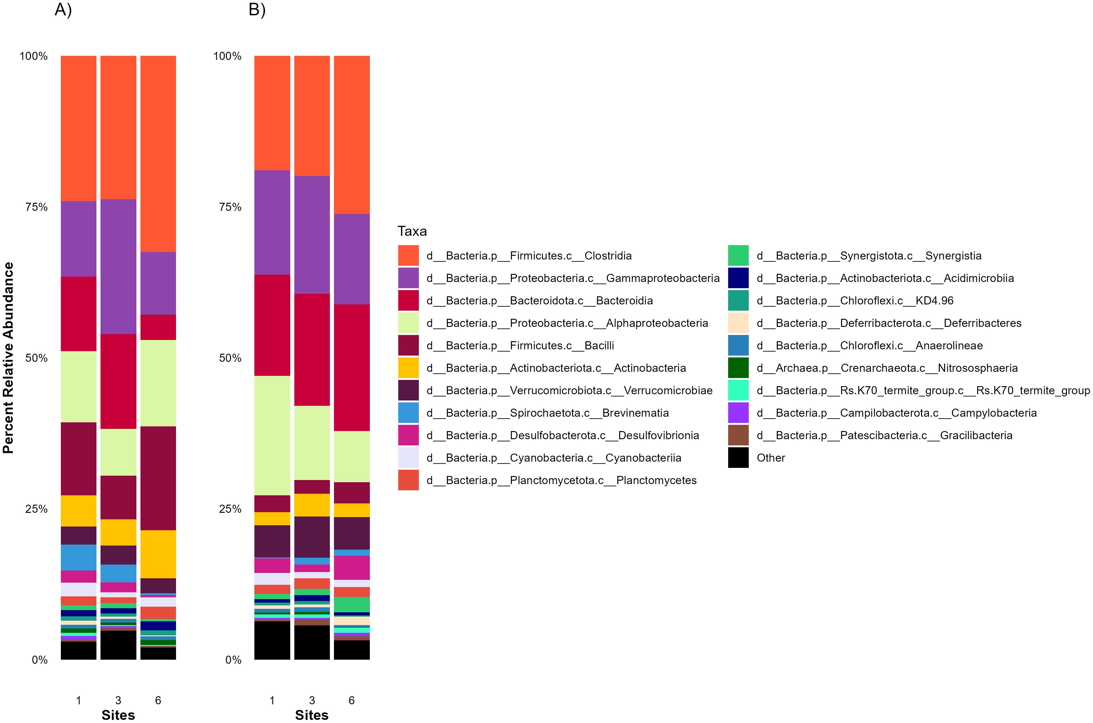 Figure 5. Average 16S relative abundances of the top 20 taxa in the intestines and stomachs of Rocky Mountain Sculpin (Cottus bondi) collected at one site upstream the WWTP (Site 1) and two sites downstream the WWTP (Sites 3 and 6) at the East Gallatin River on Sept 29, 2022, July 6 and Oct 6, 2023. The stacked bar chart illustrates the average 16S relative abundances of the top 20 taxa in the (A) intestines and (B) stomachs of C. bondi at each site. Each bar represents a site, with different colors indicating the average relative abundance of various microbial classes.