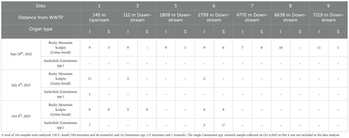 A total of 164 gastrointestinal samples were collected from Rocky Mountain Sculpin (Cottus bondi) and suckerfish (Catostomus spp.) across three sampling dates: September 29, 2022; July 6, 2023; and October 6, 2023 (Table 1). Of these, 150 samples were from C. bondi (104 intestines, 46 stomachs), and only 14 were from Catostomus spp. (13 intestines, 1 stomach) due to an unexpected drop in Catostomus spp. abundance in 2023. However, these data were retained as no microbiome data are currently available for these species. Sampling occurred at seven sites (Sites 1, 3, 5, 6, 7, 8, and 9), although not all sites or dates yielded the same number or type of GI samples due to variation in fish availability and gut contents. Notably, the single suckerfish stomach sample collected on October 6, 2023 at Site 6 was excluded from the final analysis due to lack of replicates. This uneven distribution reflects logistical constraints in field sampling of wild fish populations and highlights the value of including multiple timepoints and anatomical compartments in microbiome studies, and it must be recognized that this may limit the power of our analyses when comparing the two species.