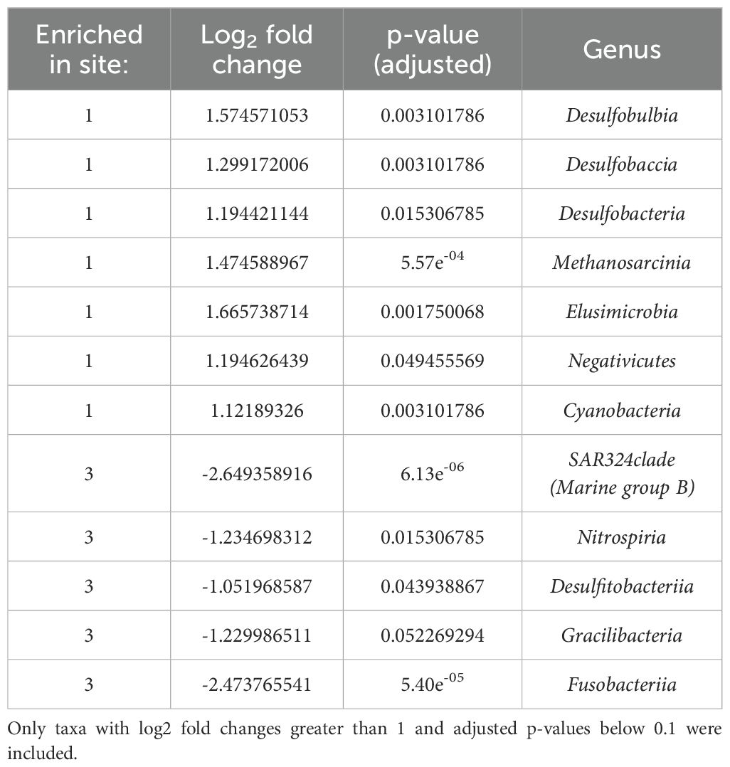 Comparing microbial communities across Sites, overall structure remained stable though subtle shifts in specific taxa were observed. These findings were supported by the DESeq2 analysis (Table 2) of the intestinal microbiota (class level) at Sites 1 and 3, which revealed significant differences in microbial abundance. At Site 1, taxa associated with sulfate reduction (Desulfobulbia, Desulfobaccia, and Desulfobacter), anaerobic metabolism (Methanosarcinia), and potential nitrogen cycling (Cyanobacteriia) were enriched, suggesting active microbial-mediated biogeochemical processes that support nutrient cycling.