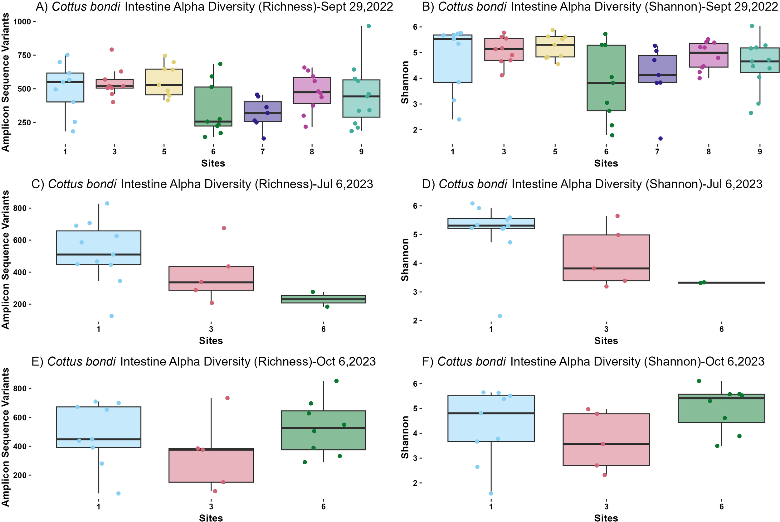 Alpha diversity metrics from microbial communities in the intestines of Rocky Mountain Sculpin (Cottus bondi) collected at one site upstream of the WWTP (Site 1) and multiple sites downstream of the WWTP at the East Gallatin River (Sites 3-9) during the fall of 2022 and summer and fall of 2023. (A) Observed Amplicon Sequence Variants (ASVs) for Sept 19th, 2022. A significant difference was detected between sites (p= 0.02776, ANOVA). Pairwise comparisons did not show significant differences between specific site pairs, possibly due to variability in sample sizes. (B) Shannon diversity index for Sept 19th, 2022 for C. bondi intestines across different sites showing no significant difference (p=0.059, Kruskal-Wallis). (C) Observed ASVs for July 6th 2023. No significant differences were observed between sites (p=0.1054, ANOVA). (D) Shannon diversity index for July 6th 2023 showing no significant differences between sites (p=0.085, Kruskal-Wallis). (E) Observed ASVs for Oct 6, 2023. No significant differences were observed between sites (p=0.344, ANOVA). (F) Shannon diversity index for Oct 6, 2023 showing no significant differences (p=0.163, Kruskal-Wallis).