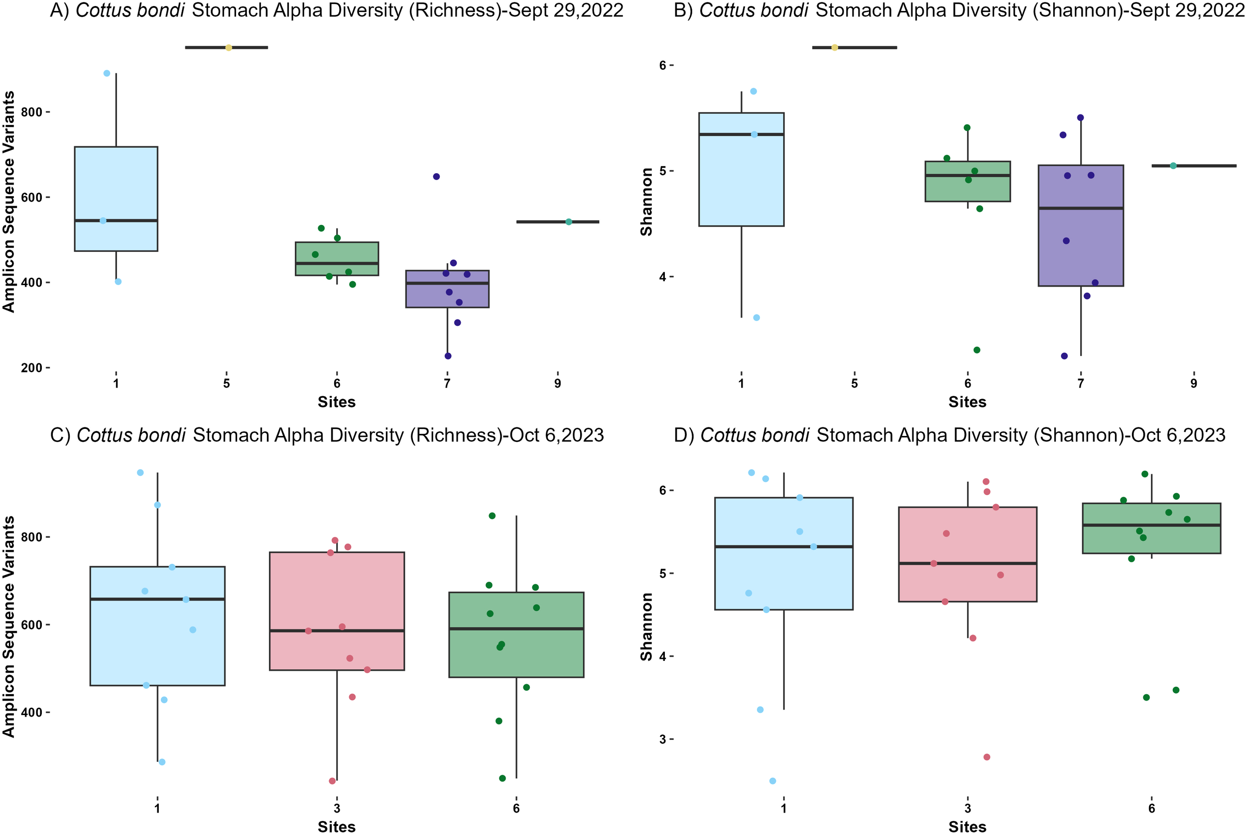 Alpha diversity metrics from microbial communities in the stomachs of Rocky Mountain Sculpin (Cottus bondi) collected at one site upstream the WWTP (Site 1) and multiple sites downstream the WWTP at the East Gallatin River (Sites 3-9) during the fall of 2022 and fall of 2023 separated by date of collection. (A) Observed Amplicon Sequence Variants (ASVs) for Sept 29, 2022. A significant difference was observed between sites (p= 0.01257, ANOVA). There was only one sample from sites 5 and 9, which limits the statistical power and significance of pairwise comparisons involving these sites. (B) Shannon diversity index for Sept 29, 2022 for C. bondi stomachs across different sites showing no significant differences (p=0.4219, Kruskal-Wallis). (C) Observed ASVs for Oct 6, 2023. No significant differences were detected between sites (p=0.7688, ANOVA). (D) Shannon diversity index for Oct 6, 2023 showing no significant differences between sites (p=0.7671, Kruskal-Wallis).
